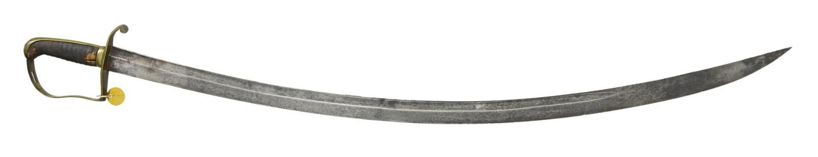 SWORD. 36" Unmarked single fuller blade, leather grip, brass ferrule. CONDITION: good overall, gray blade stained and pitted, leather grip missing wire wrap. (02-19042/JS). $200-300.