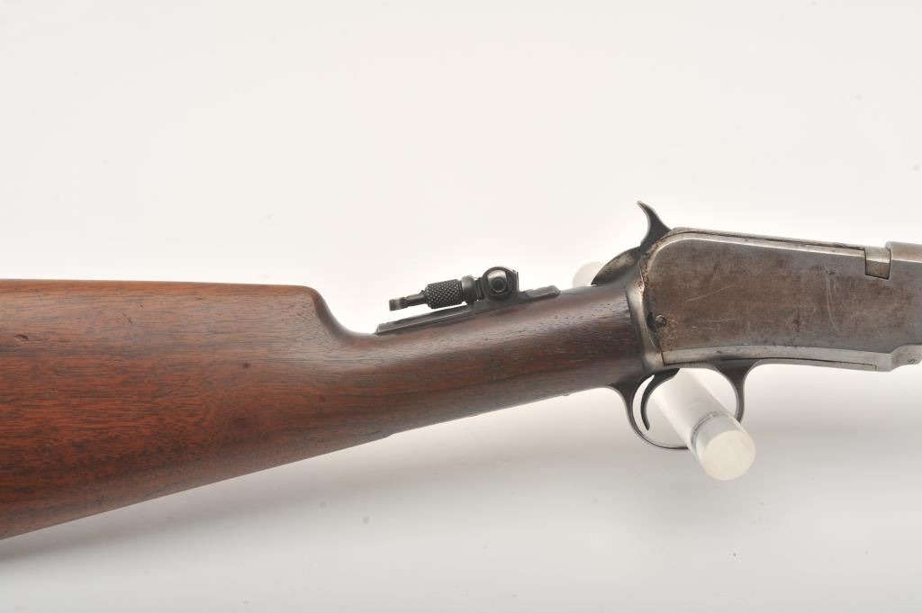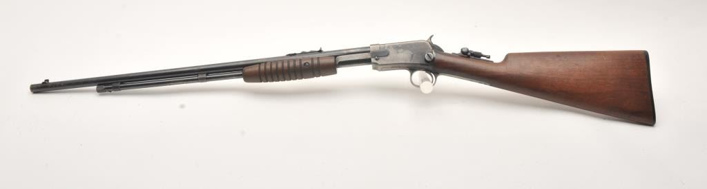 Winchester Model 62 pump action rifle, .22 short, long or LR caliber, 23” barrel, blued finish, wood stocks, Lyman adjustable flip-up tang sight, S/N 58351; overall good + condition with areas of original blued finish on barrel and loading tube, grey/brown patina on receiver, overall good bore, crisp action and markings, good to very good wood. (C&R). Est.: $250-$500.