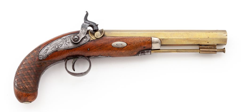 19th Century Brass Barreled Percussion Pistol, NVSN, approx. .54 smoothbore cal., 8.5'' barrel marked ''London'' on top flat, two proofmarks on left flat, engraving at barrel breech and iron tang. Serpentine iron lockplate marked ''Richardson'' and with floral engraving, matching engraving on hammer and triggerguard bow. Brass ramrod held by brass thimble integral with barrel, iron rear thimble. Iron triggerguard with fancy pineapple style front tang, German silver trap for percussion caps in butt. 2 German silver barrel wedge escutcheons, German silver forend cap. Varnished walnut (or fruitwood) stock with basketweave checkering. Condition is very good with clean metal and clear markings; stock is solid and unmarked but for crack emanating from stock retaining screw at left breech area. Est.: $1,200-$1,800. (Antique)