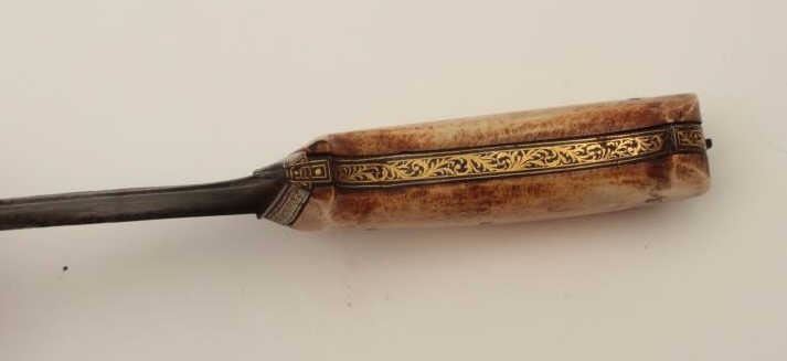 19th century mid-eastern dagger with gold damascened decoration and ivory grip. Measures 14 ¾” overall with a 10 ½” curved blade. In good overall condition showing minor pitting and sharpening. A quality blade with reinforced and thick back or spine. Est.: $350-$700
