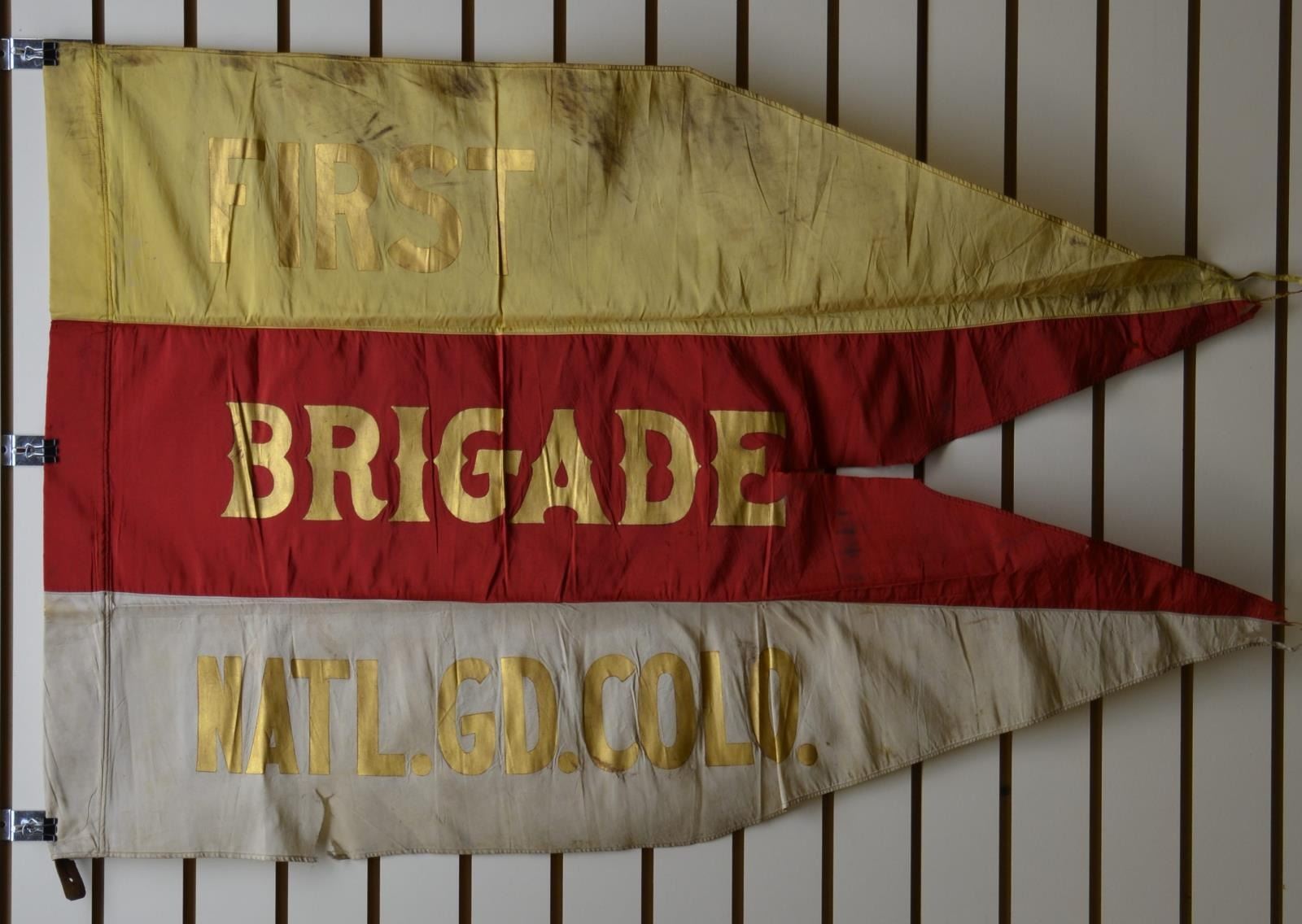 24” x 45” silk & painted swallow tail pennant, circa 1900. The roots of the Colorado national Guard go back to 1861 when two companies were formed to protect the region from Indians. Three infantry and three cavalry regiments were raised during the Civil War with some troops marching south to New Mexico Territory to defeat Confederate troops at Glorieta Pass in 1862. While no specific history has been located for the First Brigade, Colorado National Guard, this guidon style flag with three color bars, representing the combined arms make up of this brigade, was probably a locally produced variant of guidons specifically for state use. CONDITION: good overall, several tears, soiling, frayed tips, overall sound with good paint. (02-17547-50/JS). $100-200.