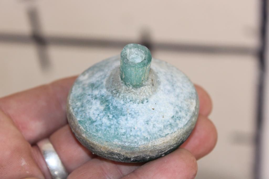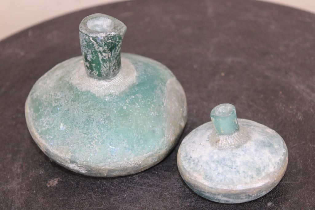 2 Beautiful Ancient Roman Glass Bottles. The larger bottle measure 3 3/8" in diameter x 3.25" Tall and weighs 10 oz. The smaller bottle measures 1.75" Tall x 2.25" in Diameter and weighs 80.93 g. Roman glass dates back around 2,000 years, originating during the time of the Roman Empire. The production of glass in the Roman era significantly advanced with the invention of glassblowing around 50 BC. This innovation made glass more accessible and allowed for a wider variety of shapes and designs. (ONE$) ANCIENT ARTIFACTS