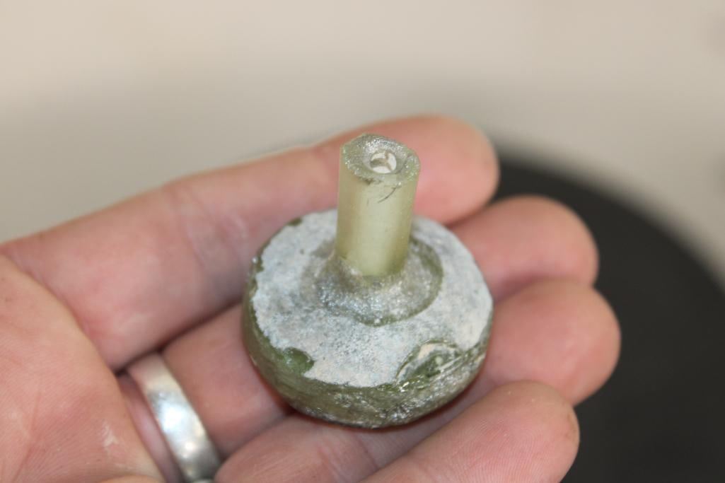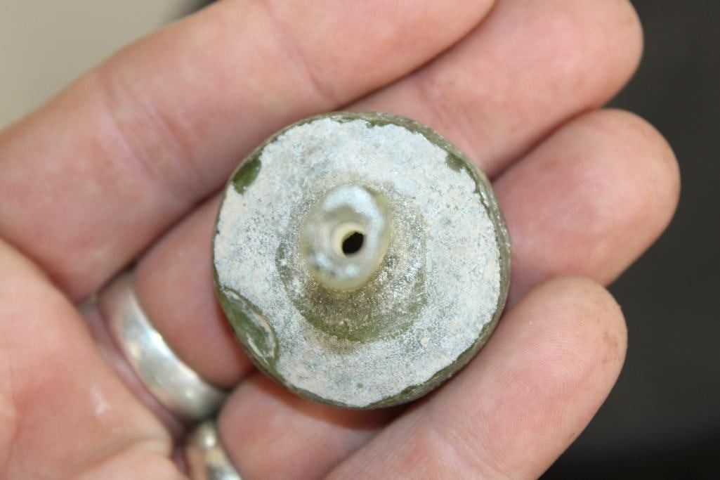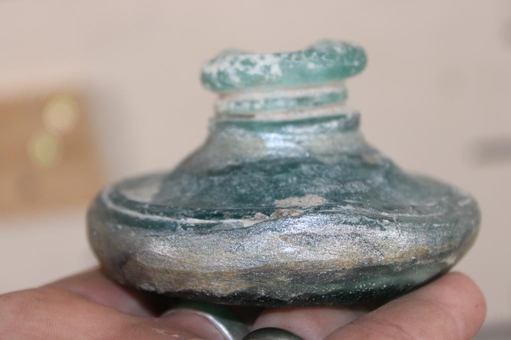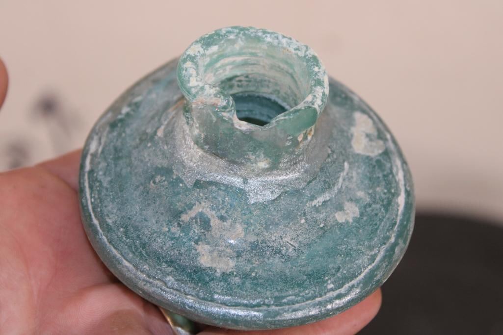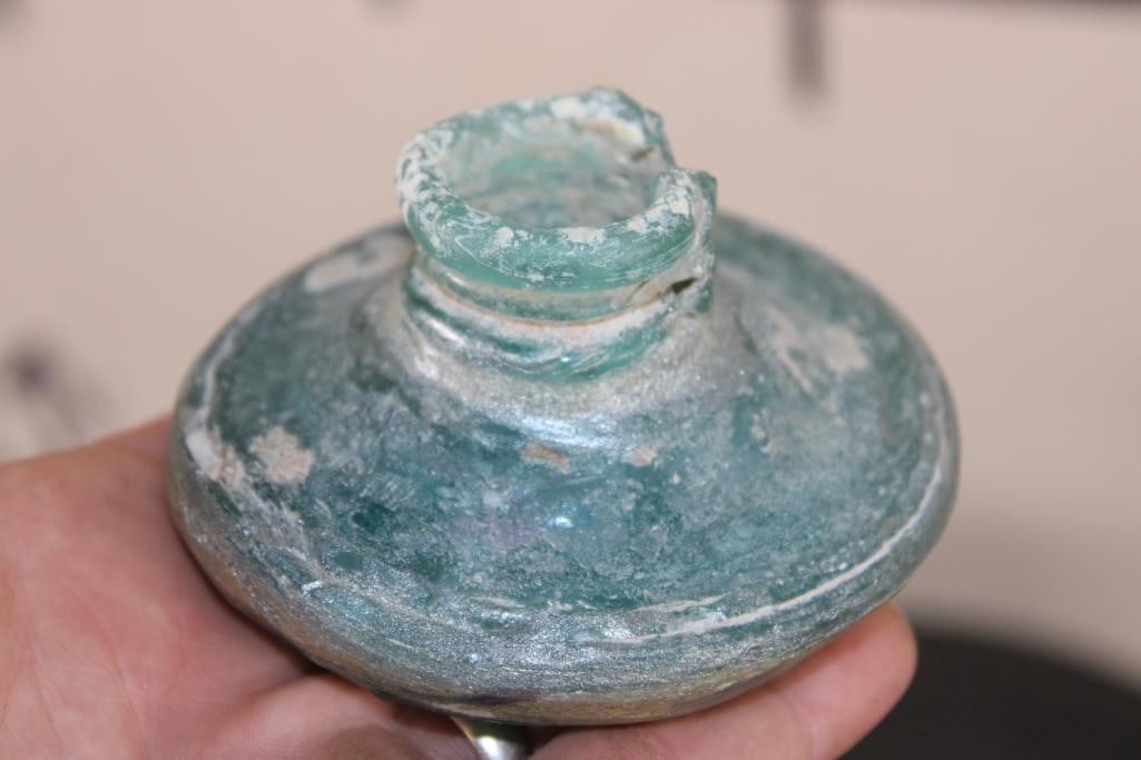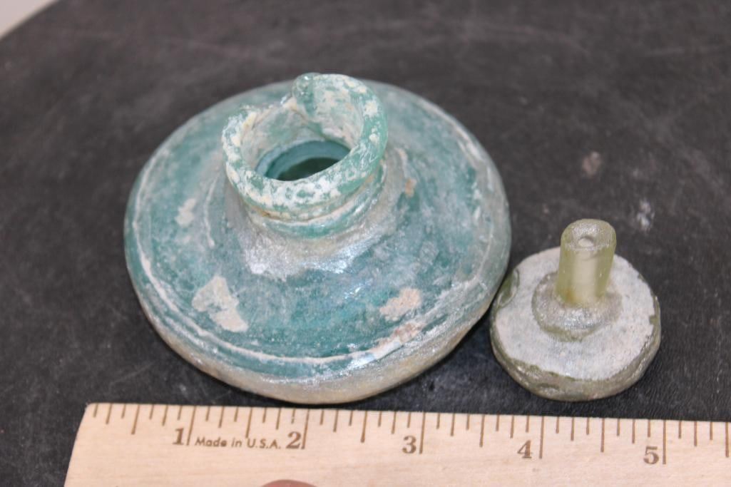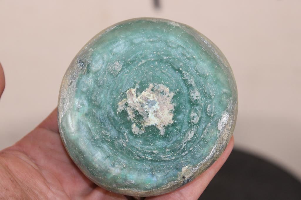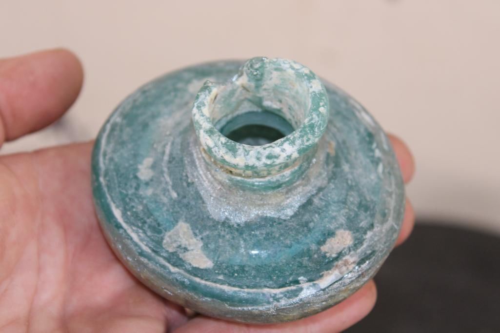 2 Beautiful Ancient Roman Glass Bottles. The larger bottle measures 3.5" in diameter x 2" Tall and weighs 189.91 g. The smaller bottle measures 1.5" Tall x 1.5" in Diameter and weighs 27.22 g. Roman glass dates back around 2,000 years, originating during the time of the Roman Empire. The production of glass in the Roman era significantly advanced with the invention of glassblowing around 50 BC. This innovation made glass more accessible and allowed for a wider variety of shapes and designs. (ONE$) ANCIENT ARTIFACTS