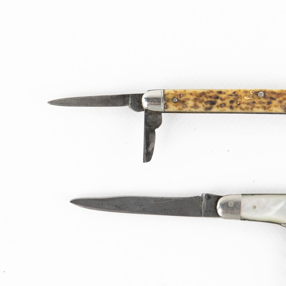 Here are 2 vintage folders from Boker - first is a 3-5/8" closed slimline, 3-blade with the lazy, sharpened main blade, small blade has been sharpened as well. One blade had been broken. Nicely jigged scales. Unusual pattern. Next is a MOP 2-blade plus corkscrew. Blades have been sharpened, single crack one pearl scale. Overall length is 3.25" closed.