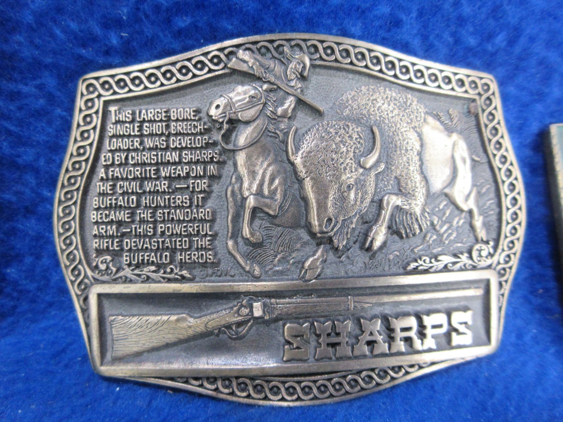 2 Brass Belt Buckles - Sharps 1979, Colt Navy 36 Cal.