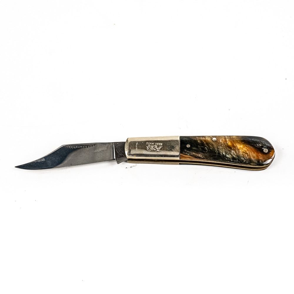 2 Bulldog Brand Solingen Germany made pocket knives. Hand-made knives are limited production high quality items. One 2 bladed whittler knife with stag handles with original box and one single blade jack knife with irridescent bone style handles. Both knives are like new with only storage wear on bolsters. Excellent gift or collector items. 3.25-3.5" closed length.