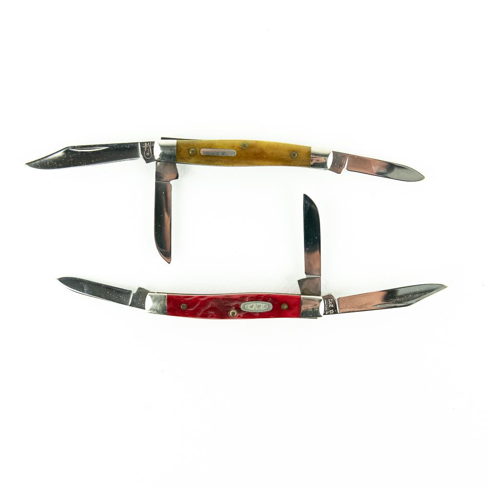 Here's a couple of small CASE 3-blade jack knives from the 90's. Beautiful red bone #DR6333 SS and a #6333 SS with smooth honey bone scales. Both in excellent condition overall with blades that appear unused and having good snap. These knives are 2-11/16" closed.