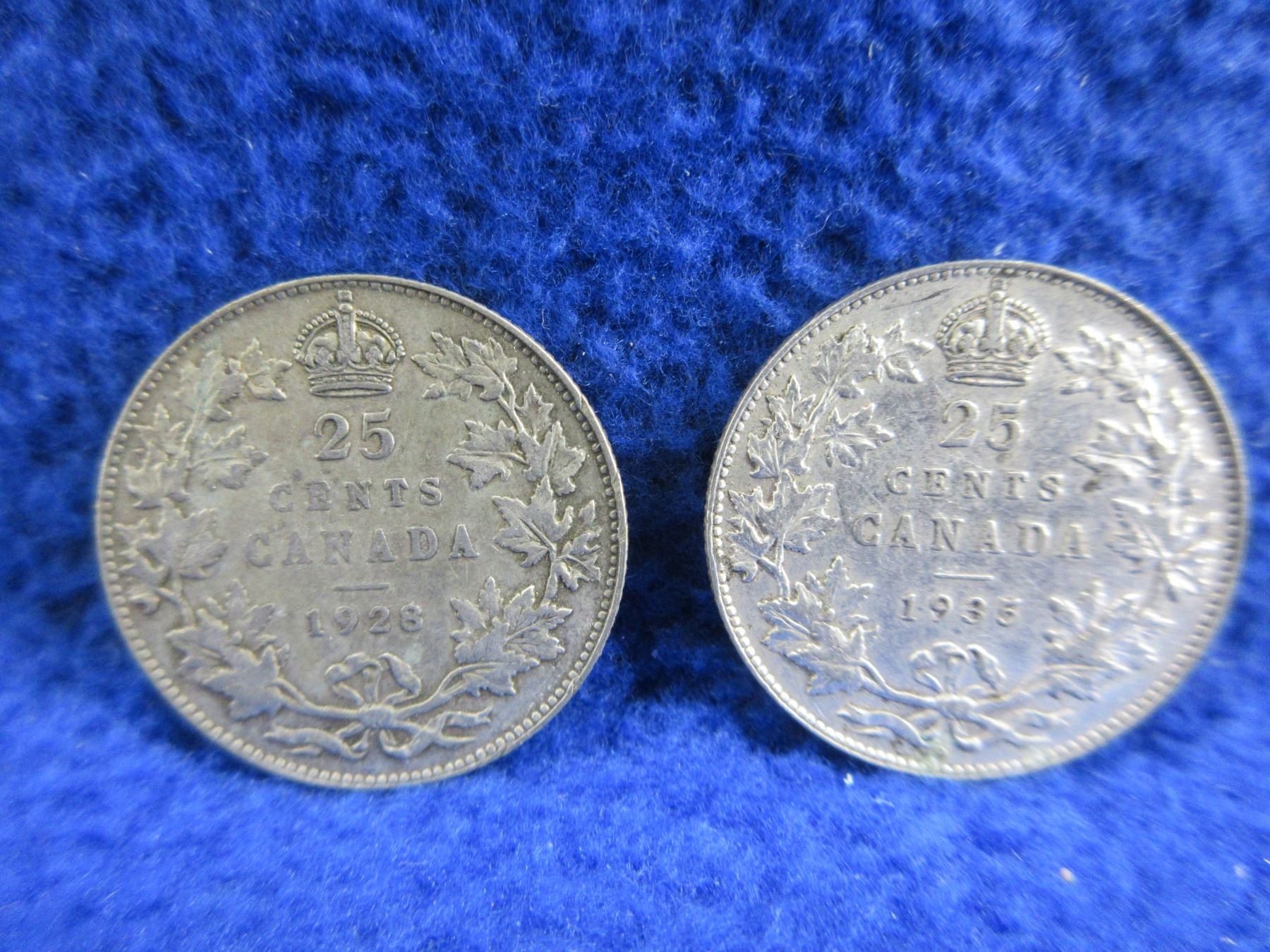 2 Canadian 25 Cent Coins - .800 Silver - 1928, 1935