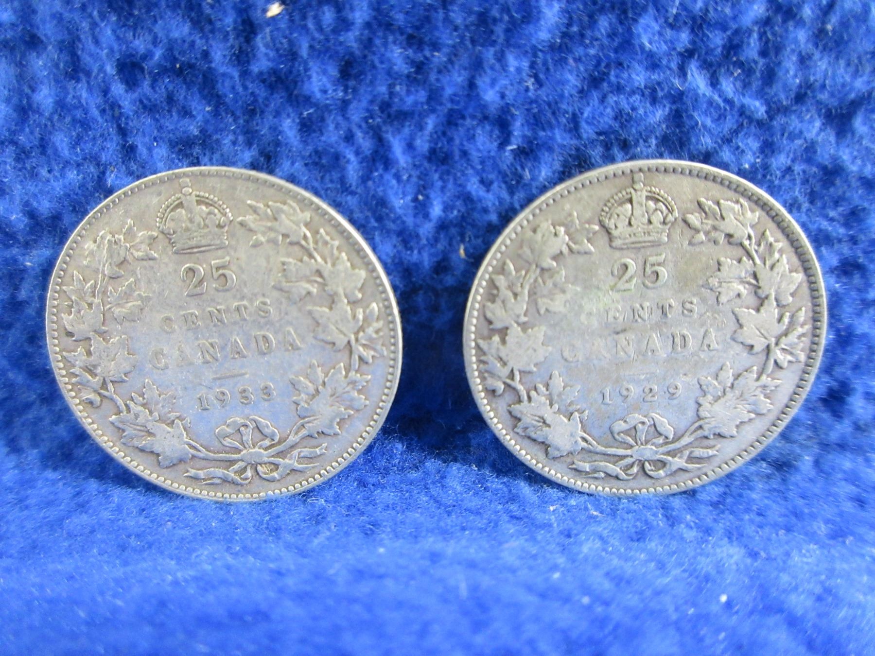 2 Canadian 25 Cent Coins - .800 Silver - 1929, 1933