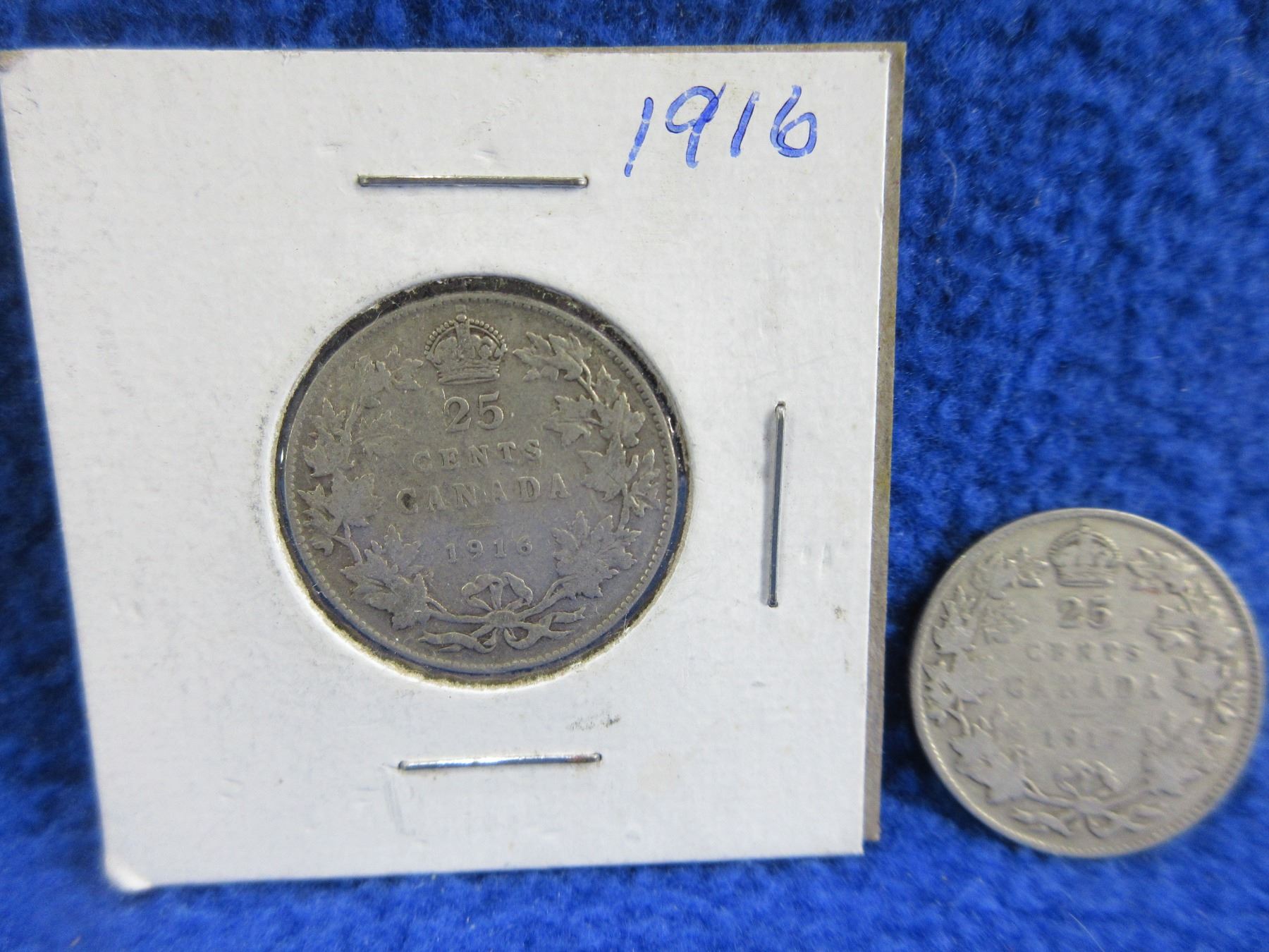 2 Canadian 25 Cent Coins - .925 Silver - 1916, 1917