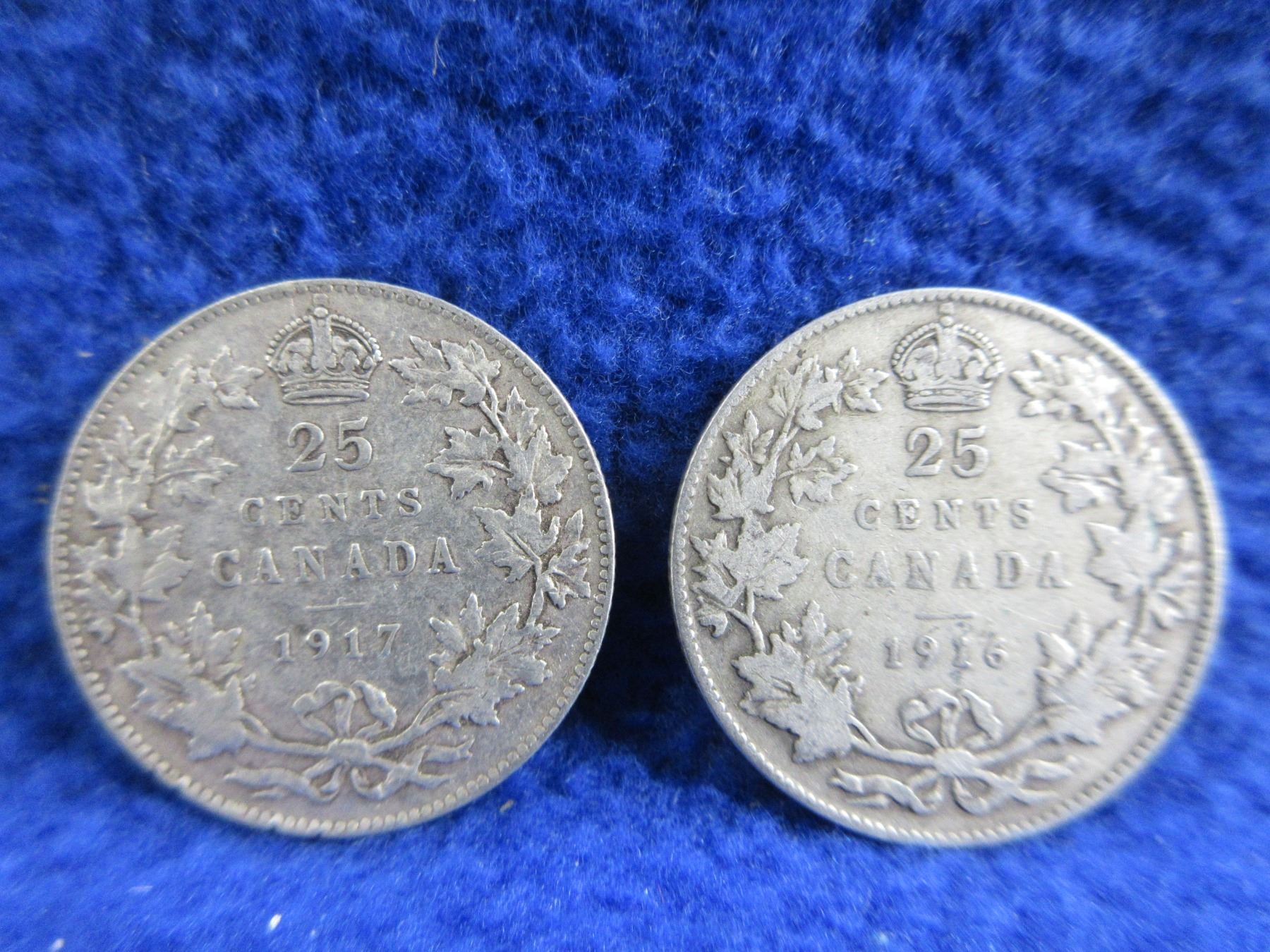 2 Canadian 25 Cent Coins - .925 Silver - 1916, 1917