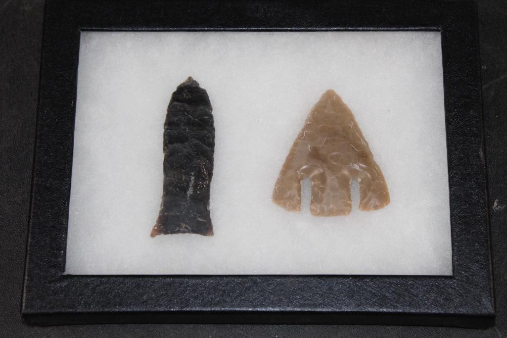 2 Classic ARROWHEAD Points, Plainview and Calf Creek. They measure 2.75" Tall x 2 1/8" Wide and 3" Tall x 1" Wide. They have been displayed in an 8" Wide x 6" Tall Case with Glass. (ONE$) ARROWHEADS*While these arrowheads came from an estate of a long time collector; we as the auction company are not going to get into a protracted discussion about age and authenticity. This collector has no paperwork or COA as to age or authenticity. While we believe the vast majority; if not all to be old; we are wholly uncomfortable with an argument with qualified and unqualified, alleged authorities.All of that to say; we are not guaranteeing age or authenticity*