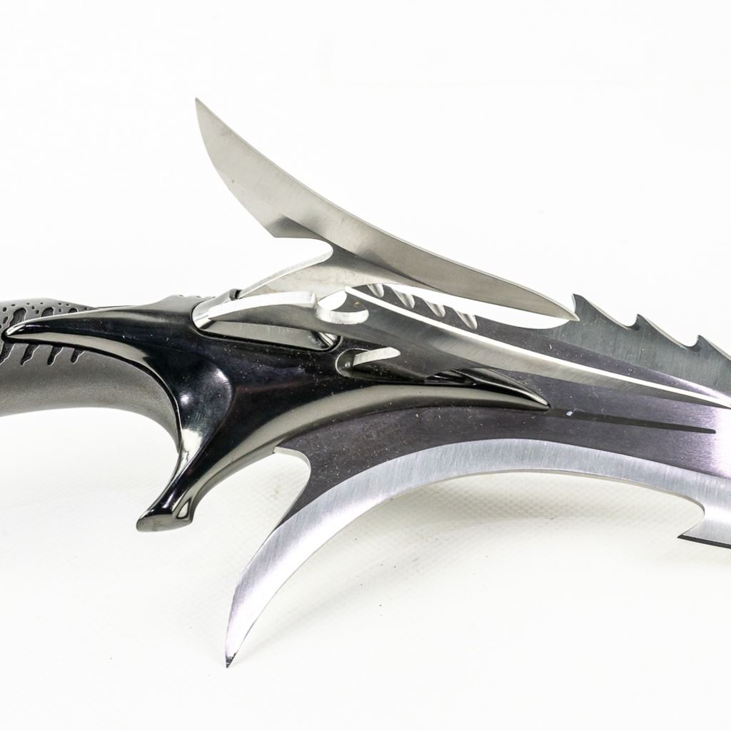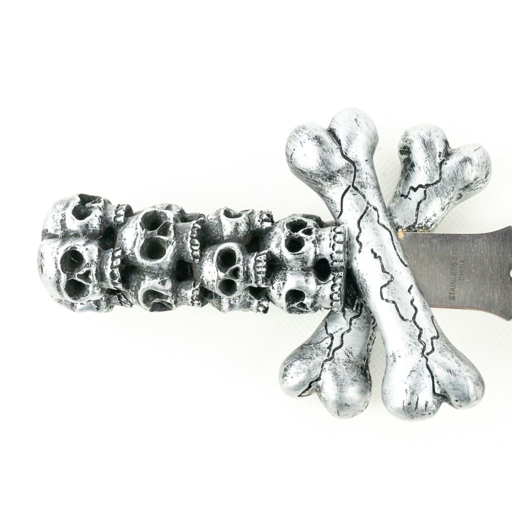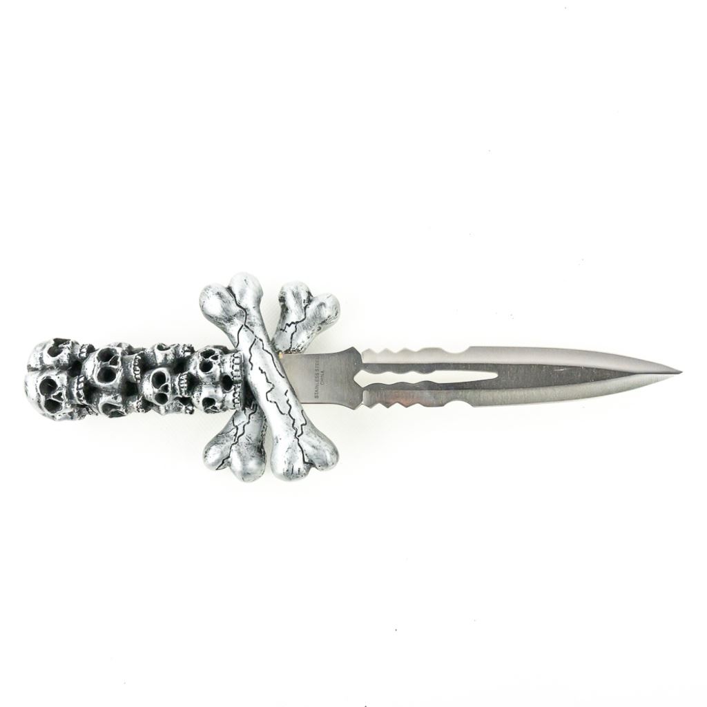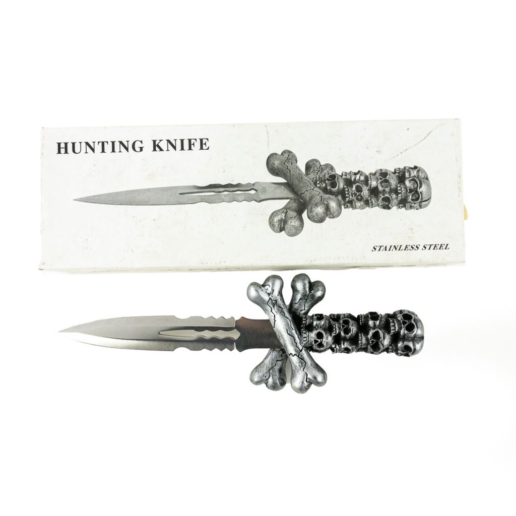 2 imported display daggers. 1 has double edge blade with skull and bones handle. Other knife has very sharp curved blade and multi-bladed handle. see photos.