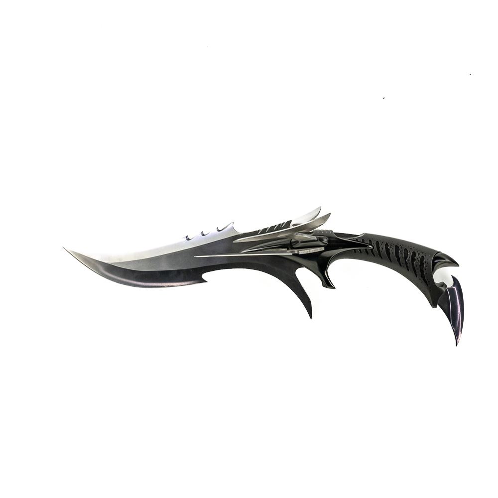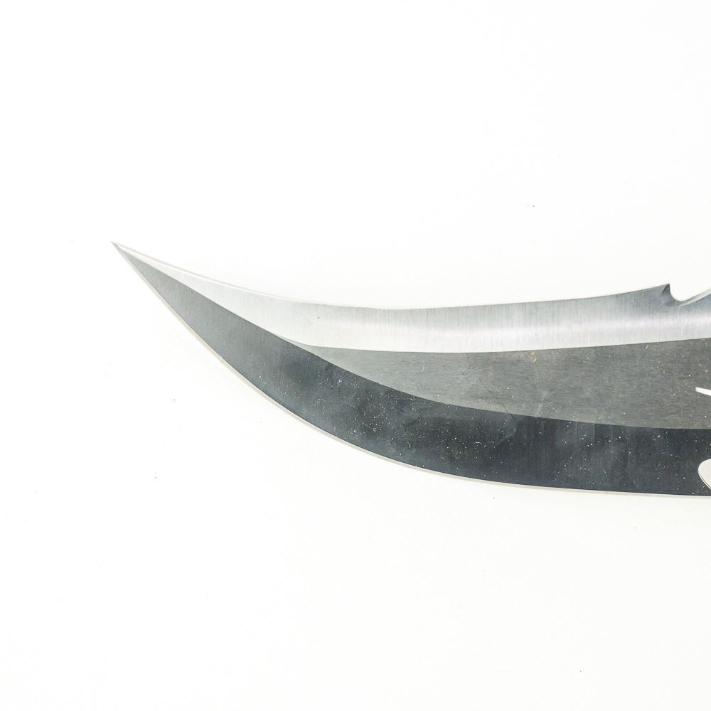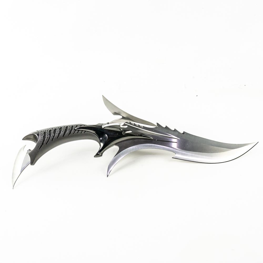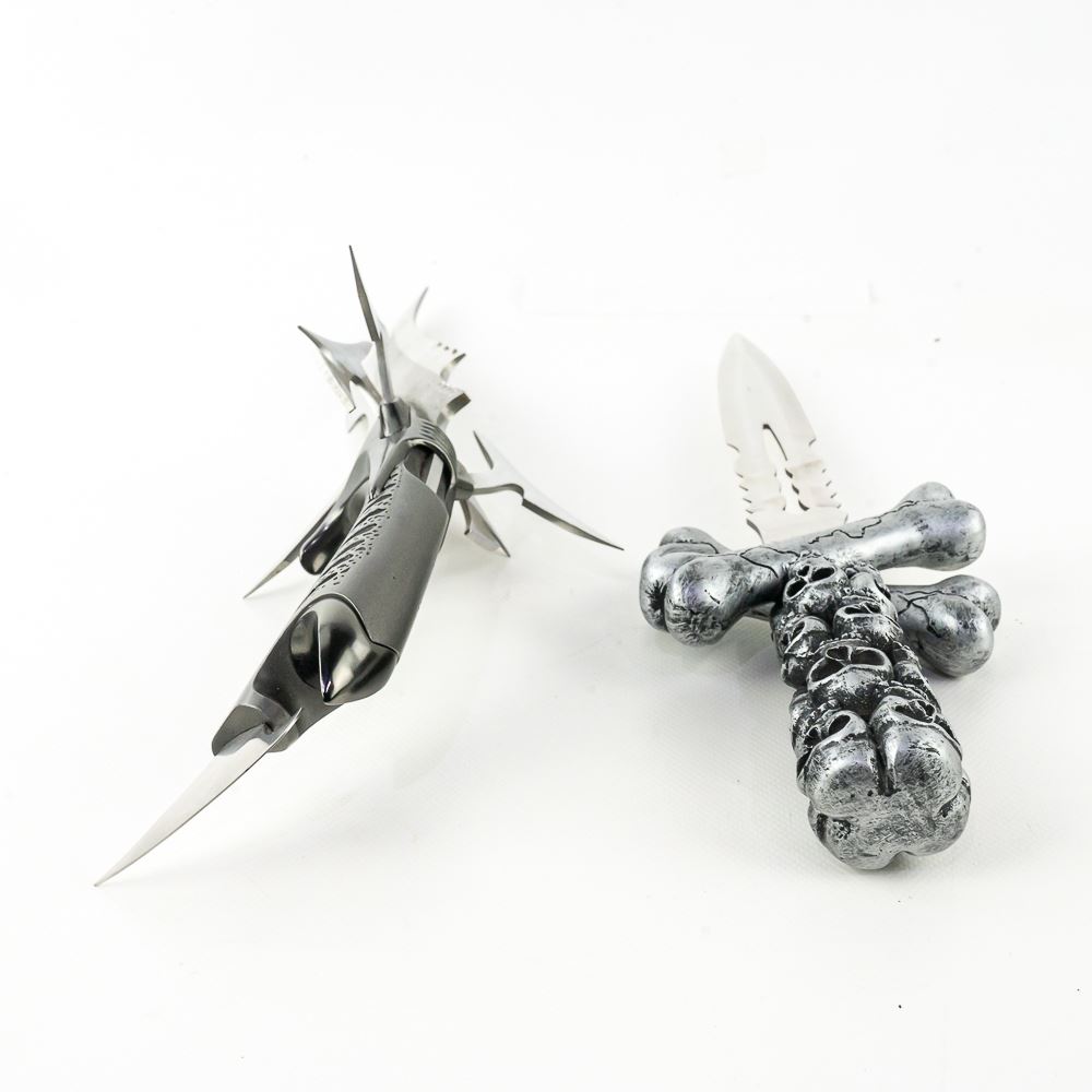 2 imported display daggers. 1 has double edge blade with skull and bones handle. Other knife has very sharp curved blade and multi-bladed handle. see photos.