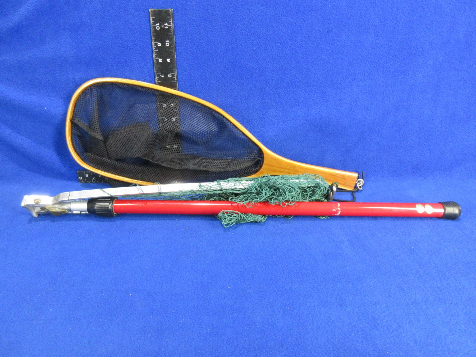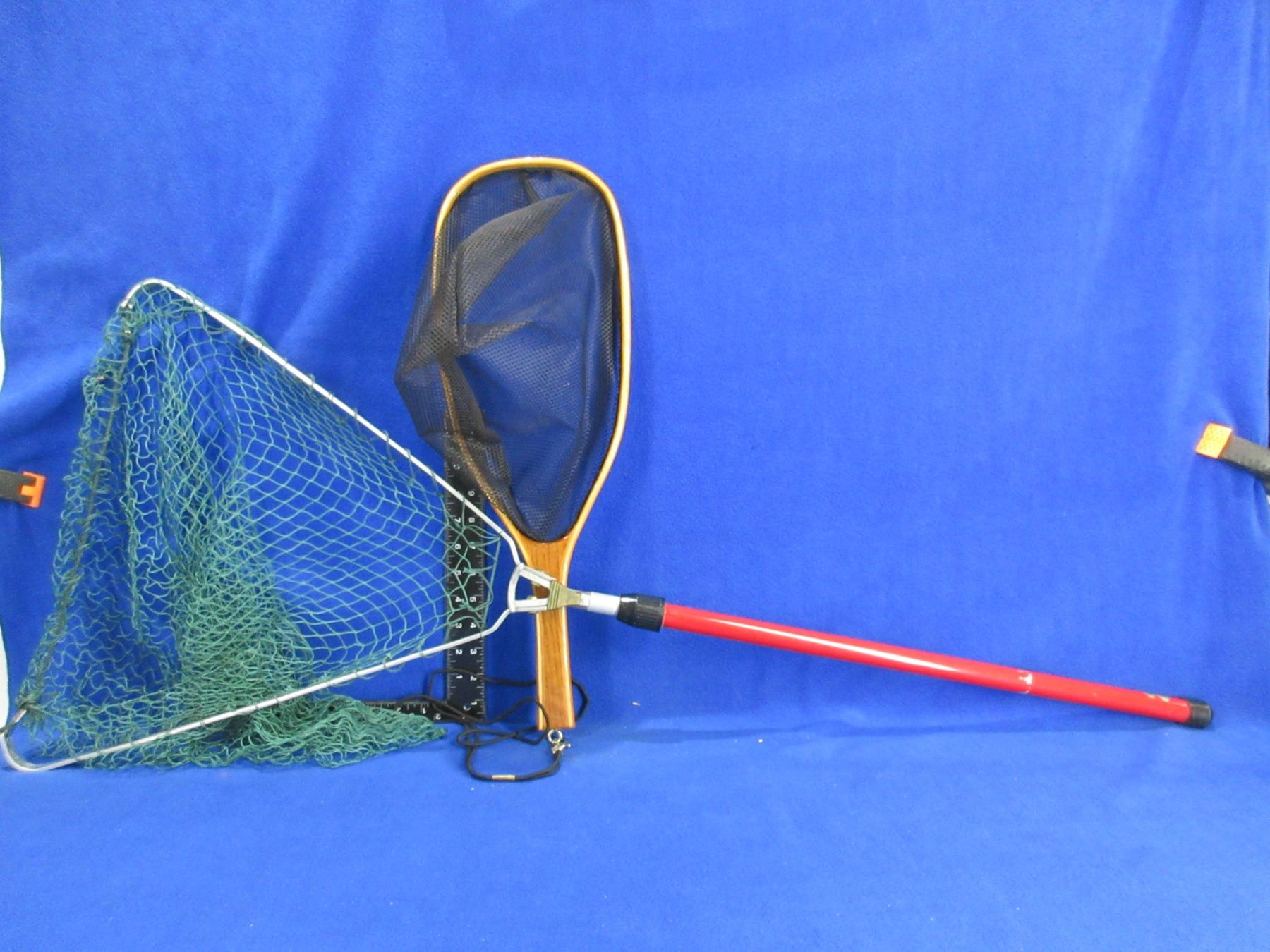 2 Fly Fishing Trout Nets - wood handle net appears new - folding net appears unused but has some corrosion