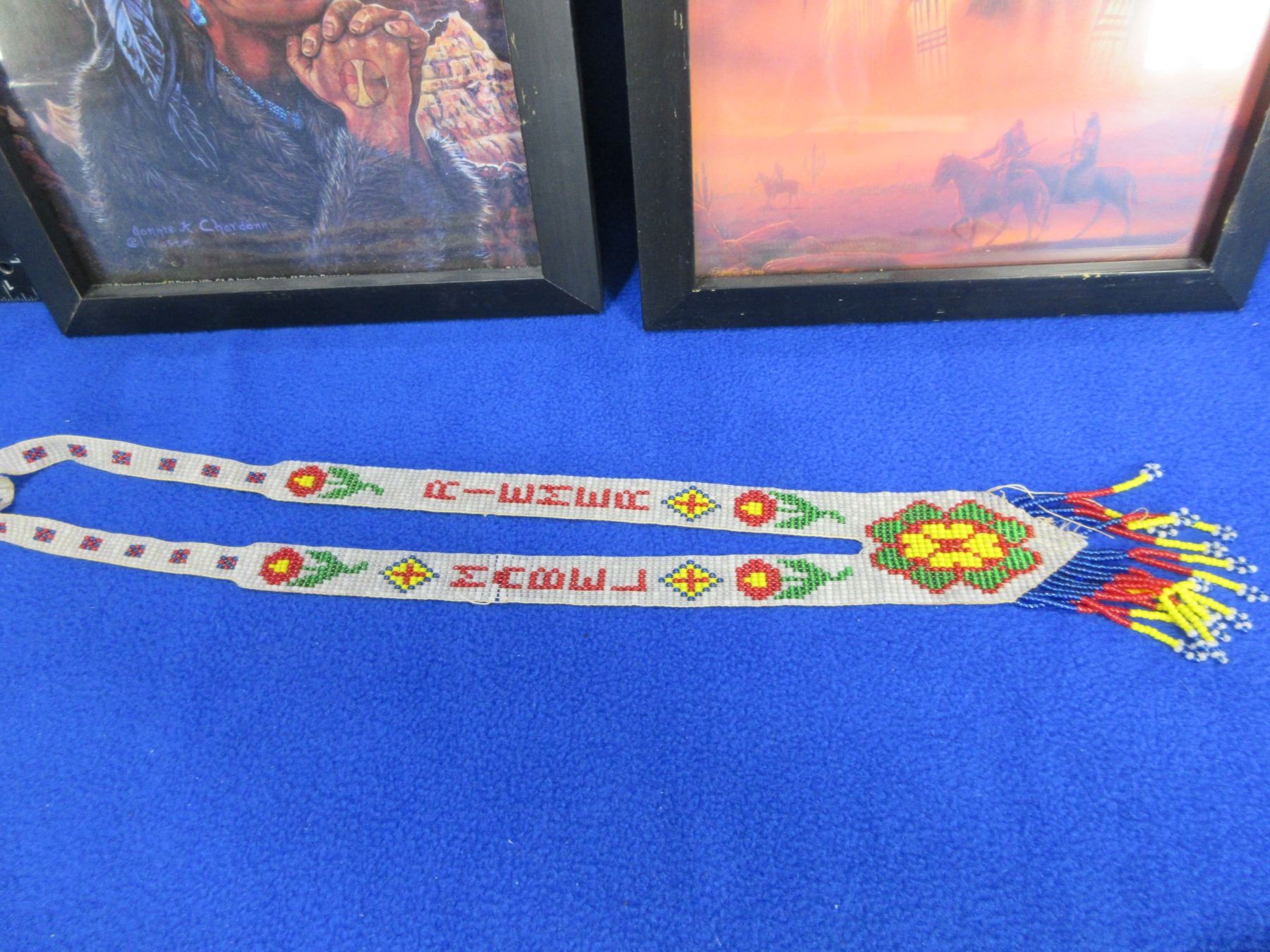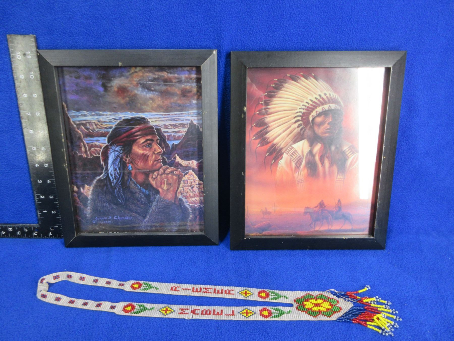 2 Framed Native American Prints and a Beaded Necklace - Prints are 11 1/4" x 9 1/4" (CB Pope and Jonnie K Chardonn)