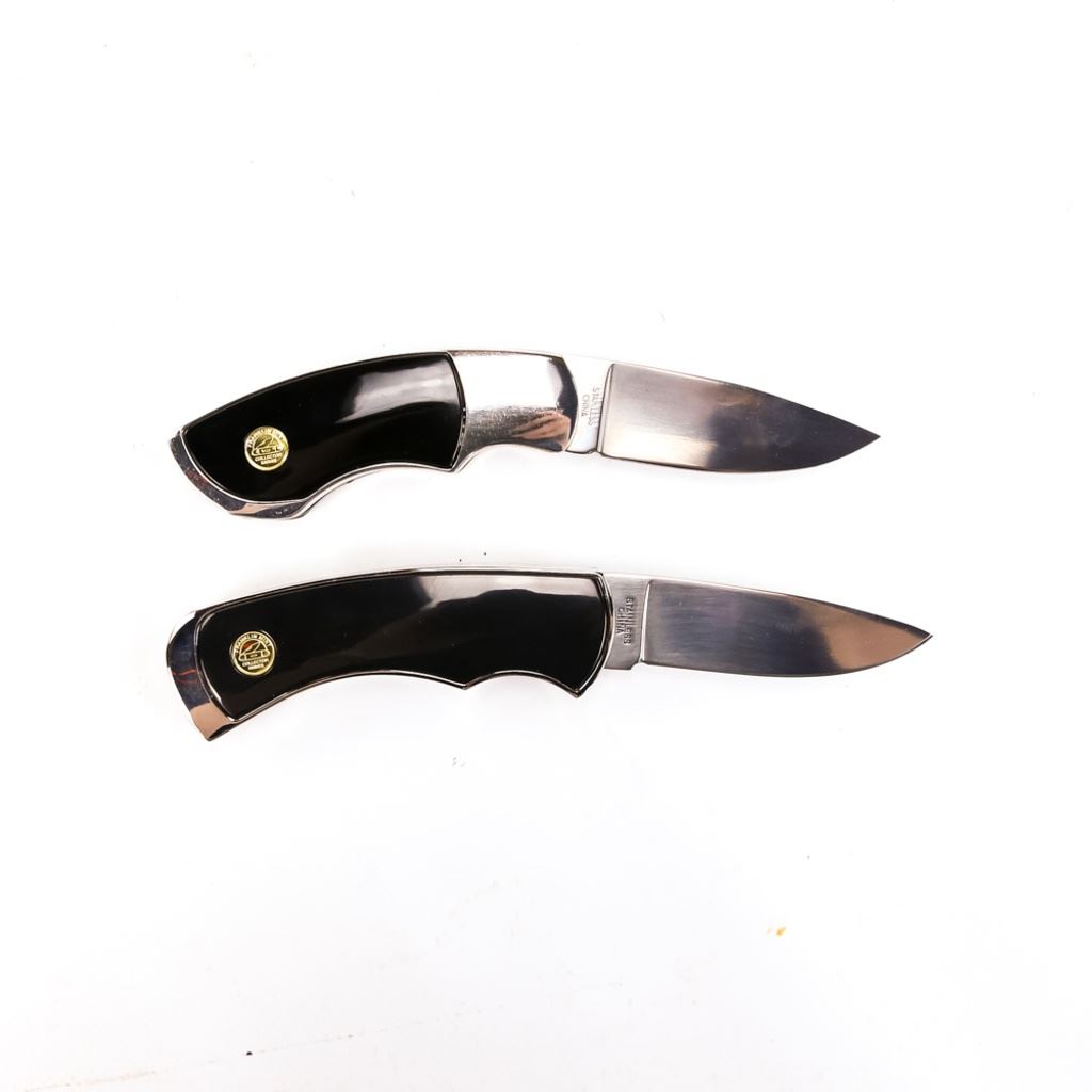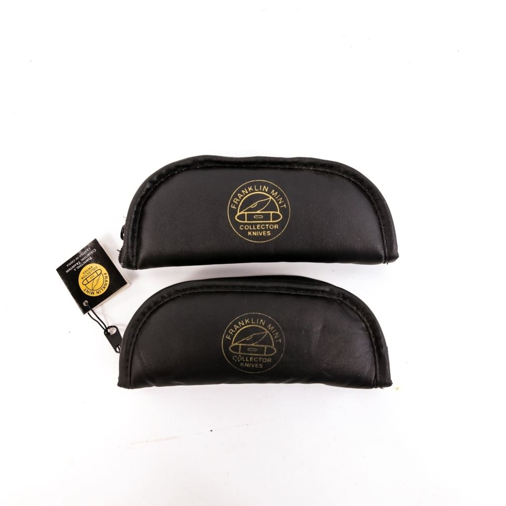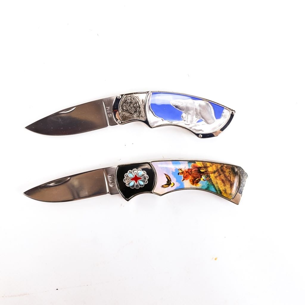 One has a portrait of a mounted Indian on horseback with an eagle, the other is a Silver Polar Bear design. Both knives are brand new in zipper storage cases.