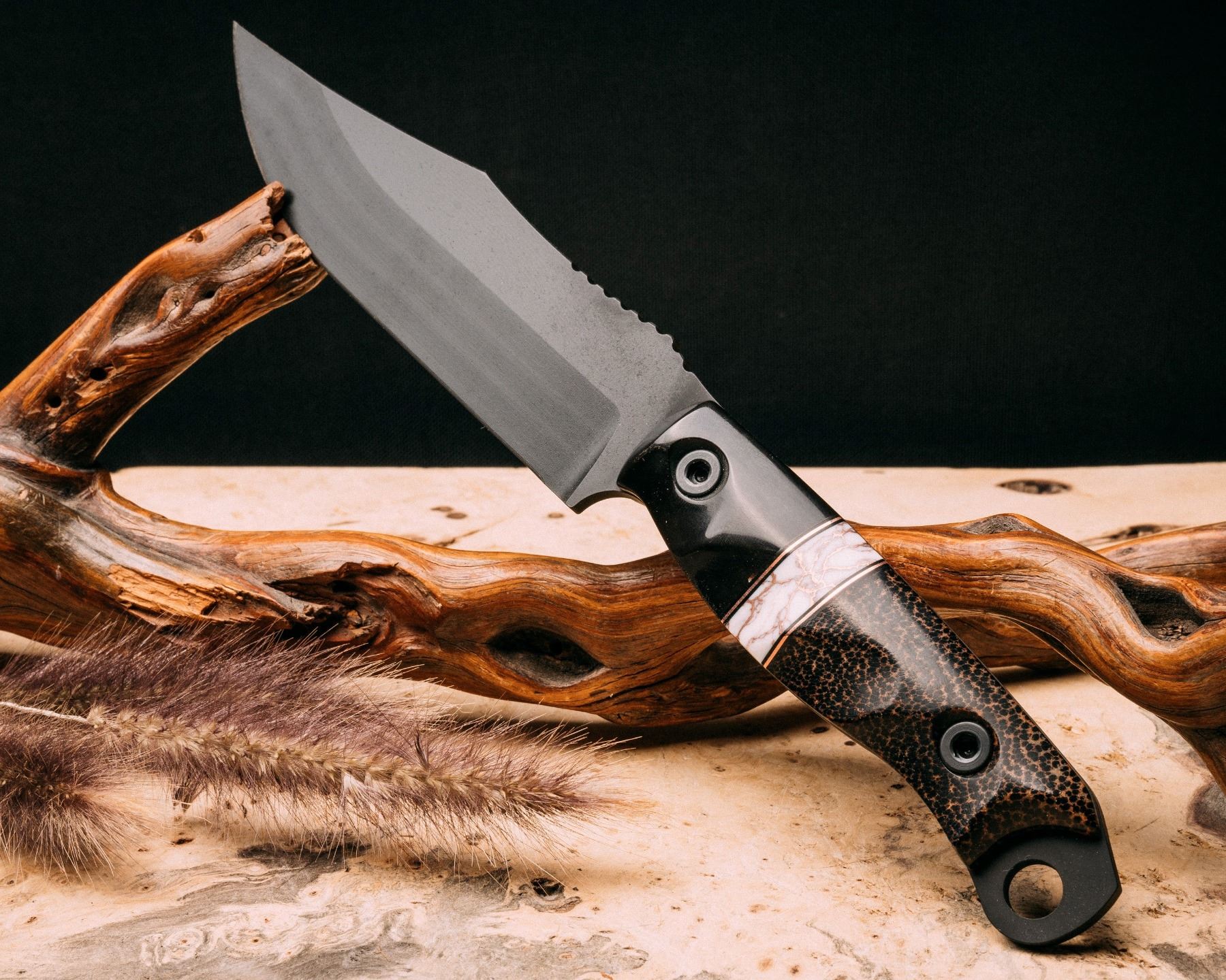 Crow Scout - buffalo horn, copper and black G10 pin striping, white with copper matrix Tru-stone split, black palm, armor black cerakote, steel allen bolts, grooved grip. 10" overall, 5" blade, .15” thickness, S45vn American steel, cerakote finish, open tang.