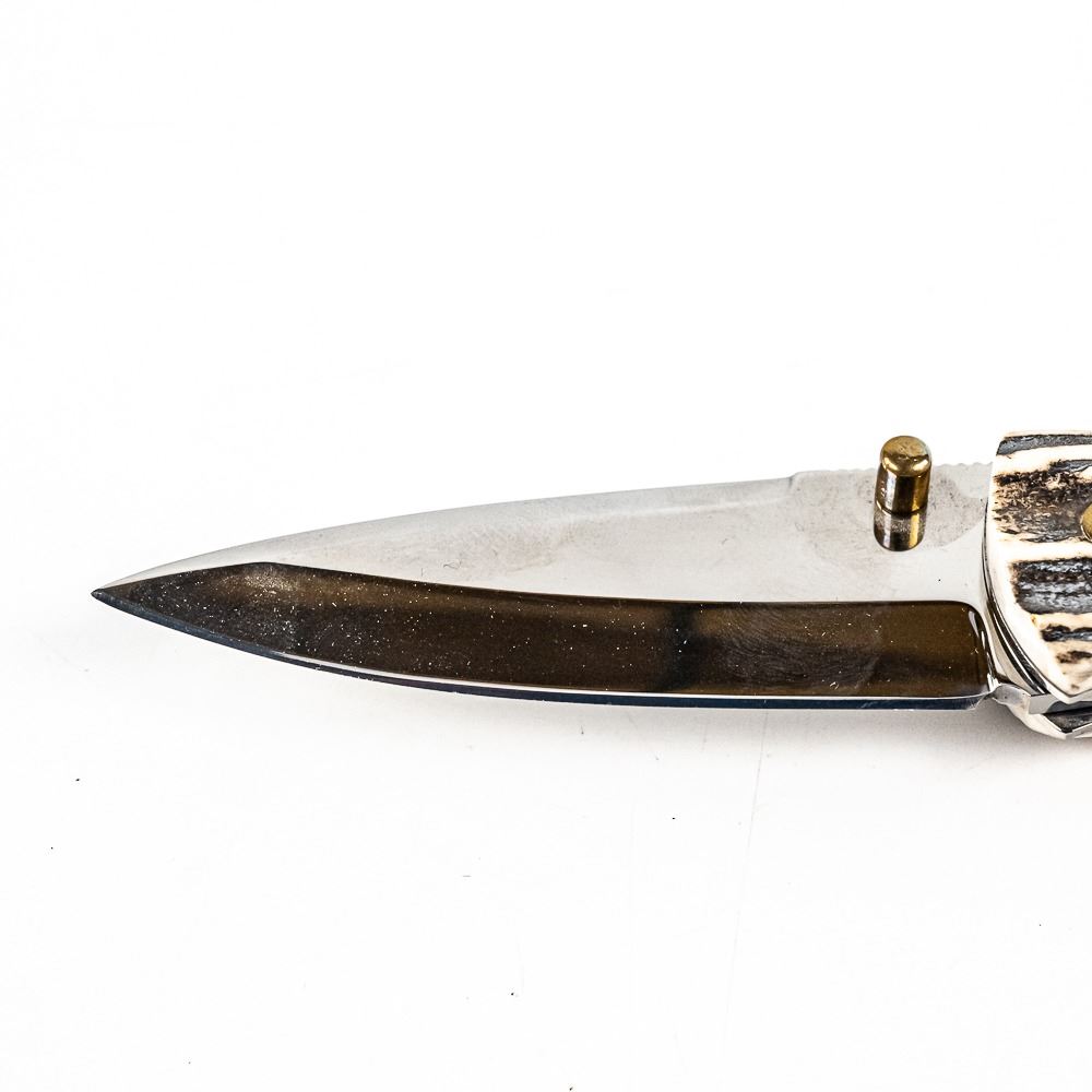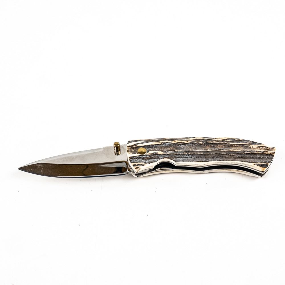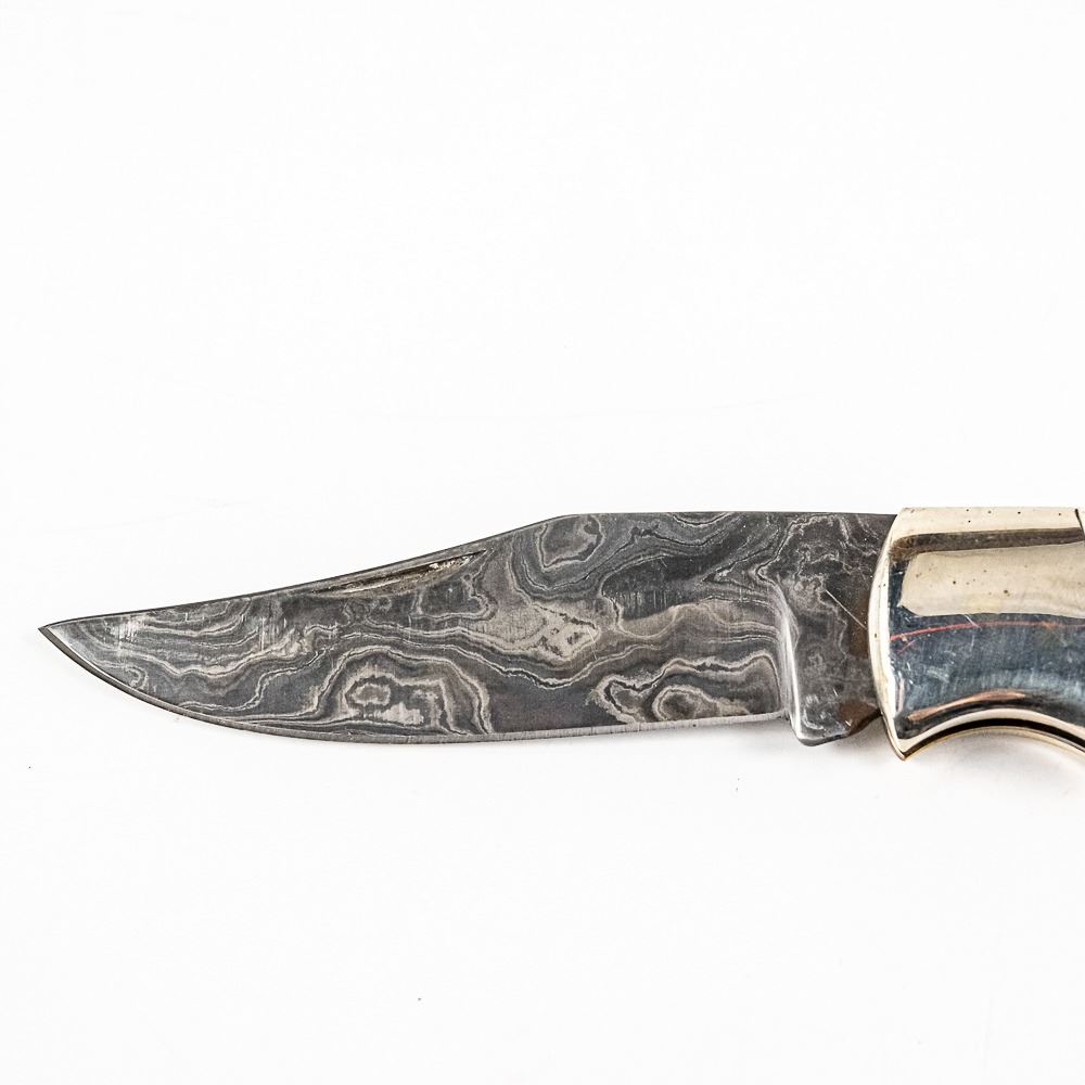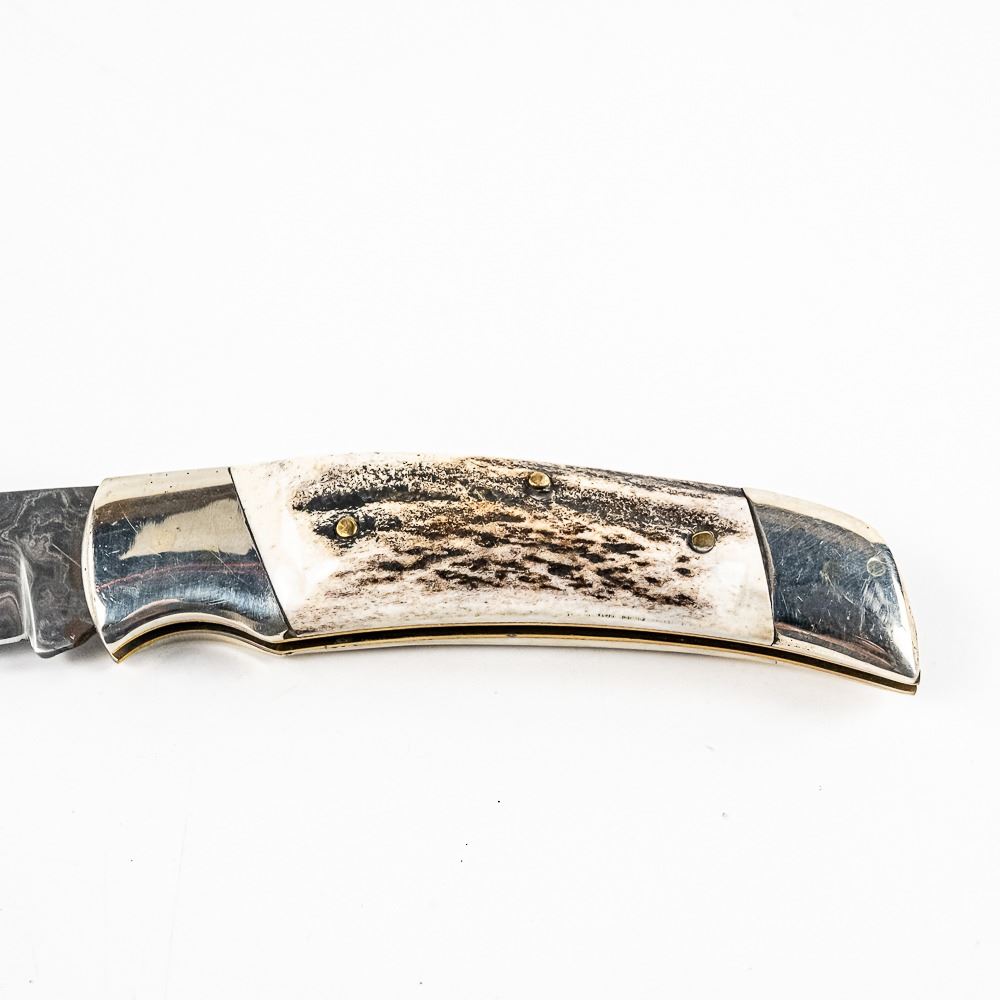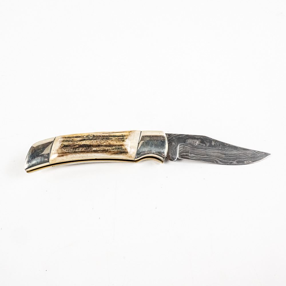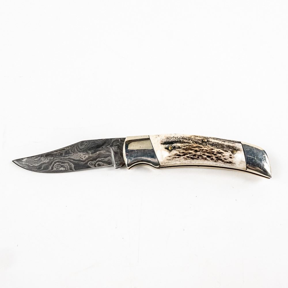 2 Hand-made Stag handle folding knives. Both appear to be custom made pieces with file-cut liner on one and damascus steel blade on the other. No visible makers mark on either knife. Damascus knife has some surface rust inside handle area on blade, otherwise both knives are in excellent condition with only minor storage wear. Very nice display pieces. 4.25-4.75" closed length. See photos.
