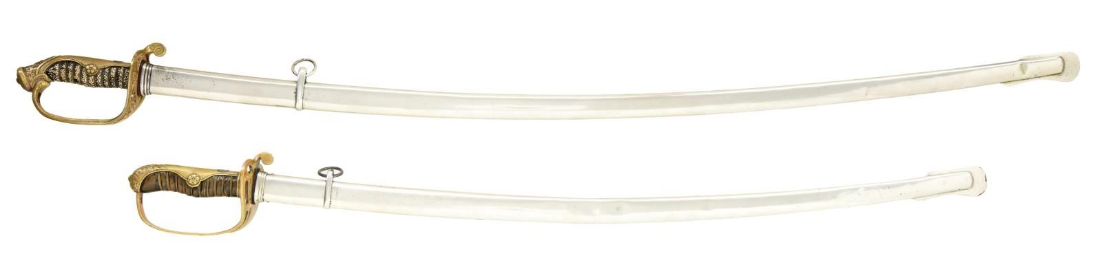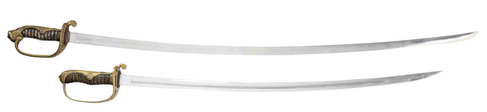 1) ARMY PARADE SABER. Overall length: 47 1/4". Blade length: 39 5/8”. The measurements on this sword are correct and it is of extraordinary length for an Army parade saber. Plain unfullered blade. Gilded brass hilt with downturned quillon. Pierced guard with a rather plain knuckle now that has some engraving where it meets the pommel. Cherry blossom decorated pommel with backstrap that also boasts 2 cherry blossoms. A silver hexagonal seal on the backstrap has 3 leaves in a circle. Wire-wrapped sharkskin grip. Plated iron scabbard. CONDITION: blade shows areas of original factory polish with notable scabbard wear. Hilt shows light overall wear, but only traces of the original gilded finish remain. Grip shows light wear. Scabbard shows light wear but does have a few shallow dents. 2) ARMY TYPE 19 CAVALRY SWORD. Overall length: 38 1/4". Blade length: 31 1/4". Plain blade with a single wide fuller. Gilded brass hilt with a downturned quillon. Pierced plain 5-slot guard with plain knuckle bow. Pommel is decorated with foliate & cherry blossom motifs, and the ears of the backstrap each have a 10-petal cherry blossom. The silver seal on top of the backstrap appears to have 2 crossed lozenges. Wire-wrapped wooden grip. Plated iron scabbard. CONDITION: blade shows original factory polish. Hilt is quite solid and retains traces of original gilded finish. Grip shows wear but is undamaged. Scabbard has a few minor shallow dents and has scattered areas of plating loss. PROVENANCE: From the Lifelong Collection of Glen E. Mattox. (02-18411/BF). $600-900.
