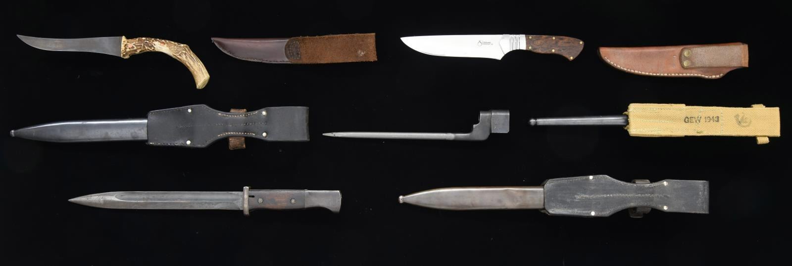 1) SUTHERLAND FIXED BLADE KNIFE. Overall: 10". Blade: 5 1/2". Nickel bolster. Full tang w/ hardwood scales & brass rivets. Brown leather sheath. CONDITION: very good w/ light wear & verdigris. 2) STAG HANDLE SKINNING STYLE KNIFE. Overall: 10 1/2". Blade: 5 1/2". Antler stag handle w/ 2 brass rivets. Brown leather sheath. CONDITION: good overall. 3) BRITISH WWII NO. 4 MK II BAYONET WITH SCABBARD & GEW 1943 CANADIAN FROG. CONDITION: very good w/ light wear. 4) GERMAN WWII S/155G 1884/98 III BAYONET WITH MATCHING NUMBERED SCABBARD & 1940 DATED BLACK LEATHER FOG. S# 3187c. CONDITION: bayonet & scabbard show reblued finish w/ prior pitting & marks. Good grips w/ light marks. Scabbard shows several dents. Frog in fair condition w/ scuffs & flexing. 5) GERMAN WWII 1884/98 III SCABBARD & BLACK LEATHER FROG. S# 5592b. Stud stamped "15". CONDITION: scabbard good reblued over prior pitting. Scabbard good w/ light wear. (02-19008-4/MD). $200-300.