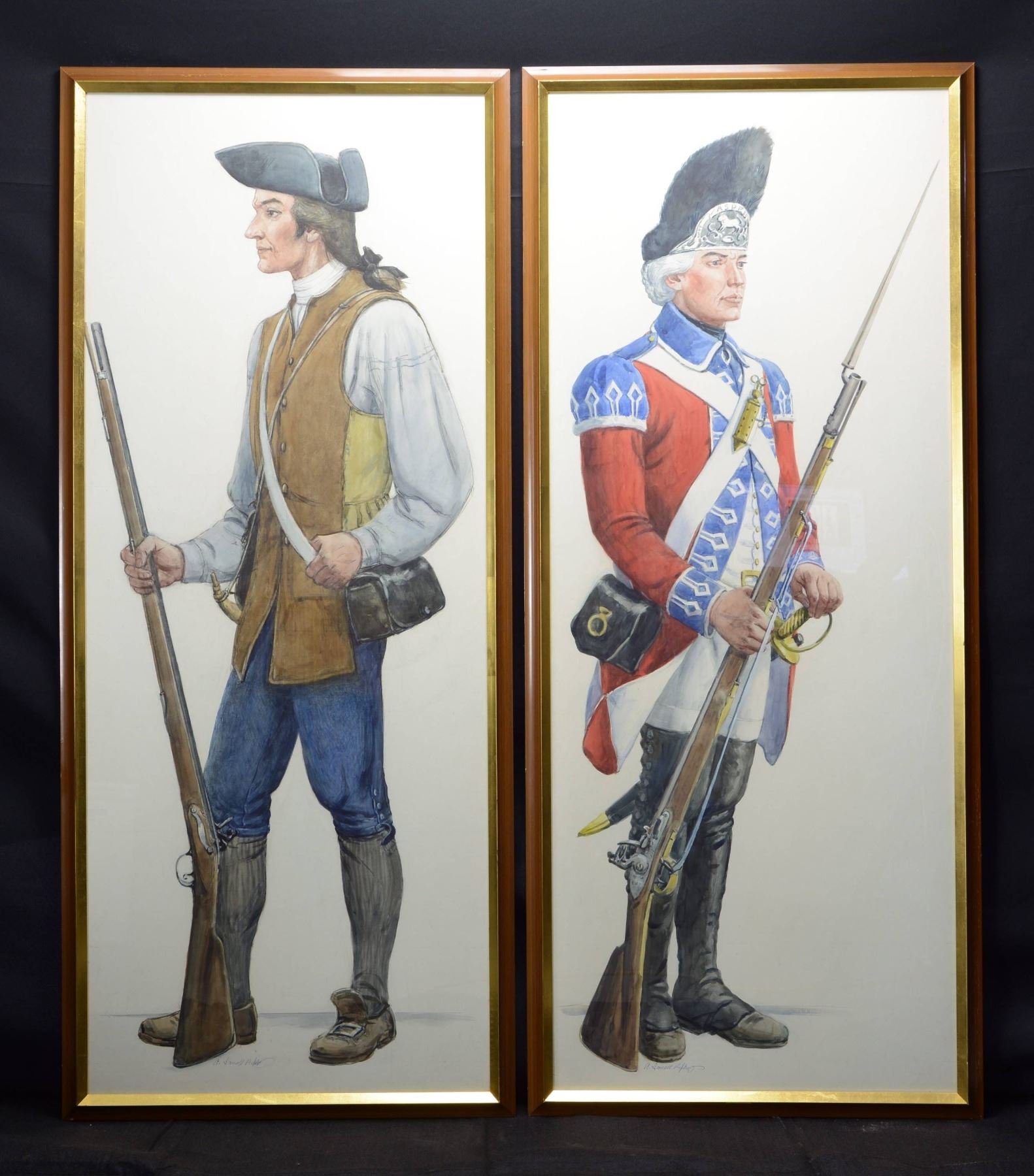 ENGLAND ARTIST AIDEN LASSELL RIPLEY. These exceptionally well-illustrated paintings have a sight size of approx. 58 1/2" x 23 1/2", and the gold highlighted wooden frames measure approx. 62" x 26 3/4". The paintings depict a Revolutionary War minuteman and a British soldier in a blue-trimmed, red uniform. The minuteman has civilian clothing with a cartridge box on a white buff strap, a powder horn, and a simple musket. The British soldier has a grenadier cap on with a cartridge box on a buff strap, infantry hanger on a buff strap, and a Brown Bess musket with fixed bayonet. Both paintings are boldly signed "A. LASSELL RIPLEY". Ripley was born in Boston, MA in the year 1896 and died in Lincoln, MA in 1969. He was a prolific painter and primarily known for sporty images, particularly ruffled grouse. These two paintings were commissioned for an NRA show in the 1950s or early 1960s. The NRA show had a strong patriotic and Revolutionary War theme, which is why Ripley created these exceptional works of art. Noted New Hampshire collector, Eldon Owens, at the NRA show expressing his admiration of the paintings and Ripley’s work in general. At the close of the show, Ripley gave Eldon Owens the paintings and they were proudly displayed in the Owens gun room until the death of this esteemed collector. The paintings are being consigned by a direct descendant of Eldon Owens. There are 4 brackets included to aid in the display of the paintings. CONDITION: the paintings are in exceptional condition and probably have the same appearance as they did at the NRA show in the 1950s. The frames show only the slightest wear. PROVENANCE: Estate of Eldon Owens. (05-89/BF). $3,000-5,000.