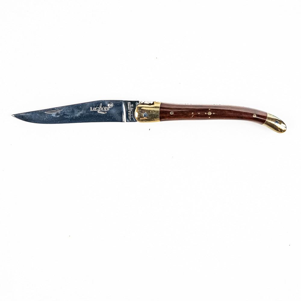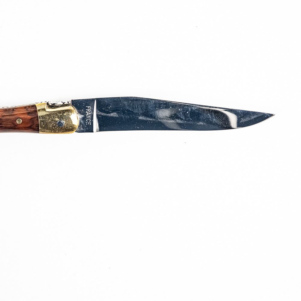 2 Laguiole French made pocket knives. 2 different models of high quality hand made pocket knives. Hand made knives with burled/tiger stripe wood handles and brass bolsters. Both knives are also in like new condition with only storage wear on bolsters. Limited production, very ornate collector knives or great gifts. 3.25-4.5" closed length.