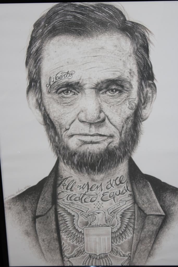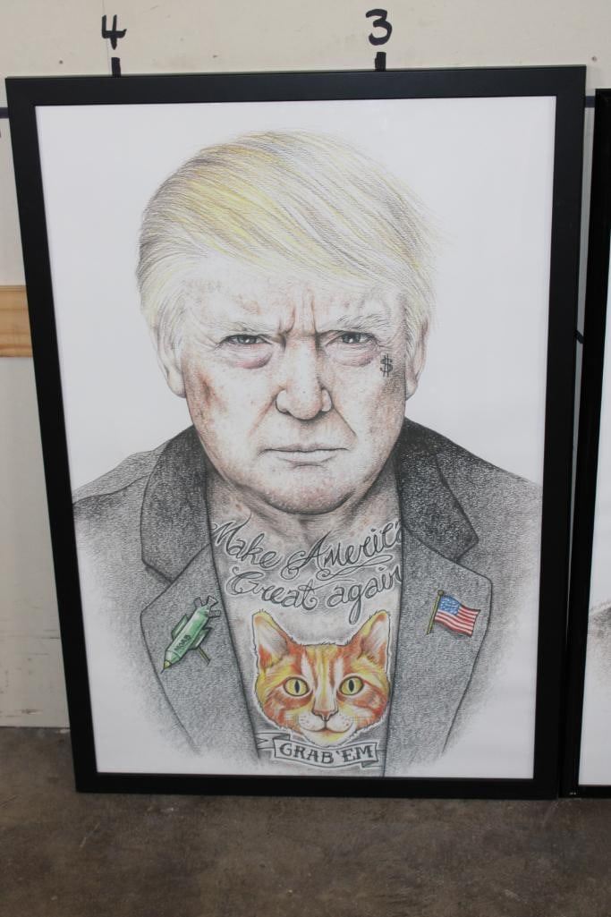 2 Large Posters of American Presidents with Tattoos. These appear to be by the same artist, they are art prints of drawings. Donald Trump is not signed, and is in a 38" Tall x 26" Wide plastic poster frame. Abraham Lincoln has been signed "Wayne Wagner". He is in a 37" Tall x 25" Wide plastic poster frame. (ONE$) PATRIOTIC ART PRINTS