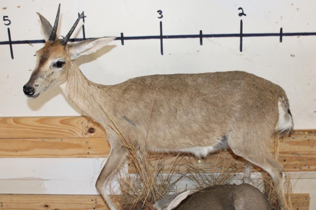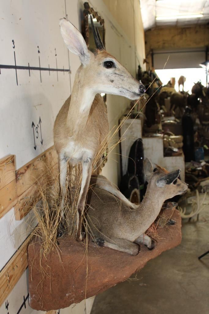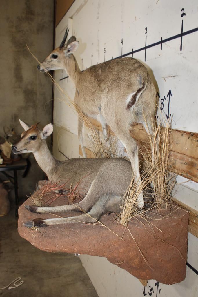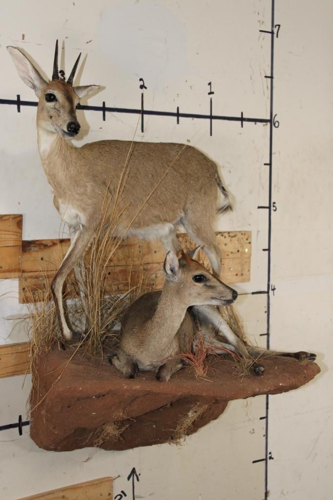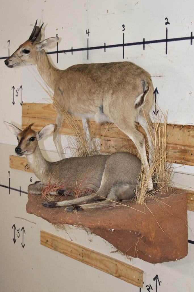 2 Life-sized COMMON DUIKERS on a simulated Rock Wall Hanging Base. It measures 3' Long x 4' Tall x 2' Depth (from wall). It has minor hide rubs and minor ear damage but is otherwise a nice mount. TAXIDERMY