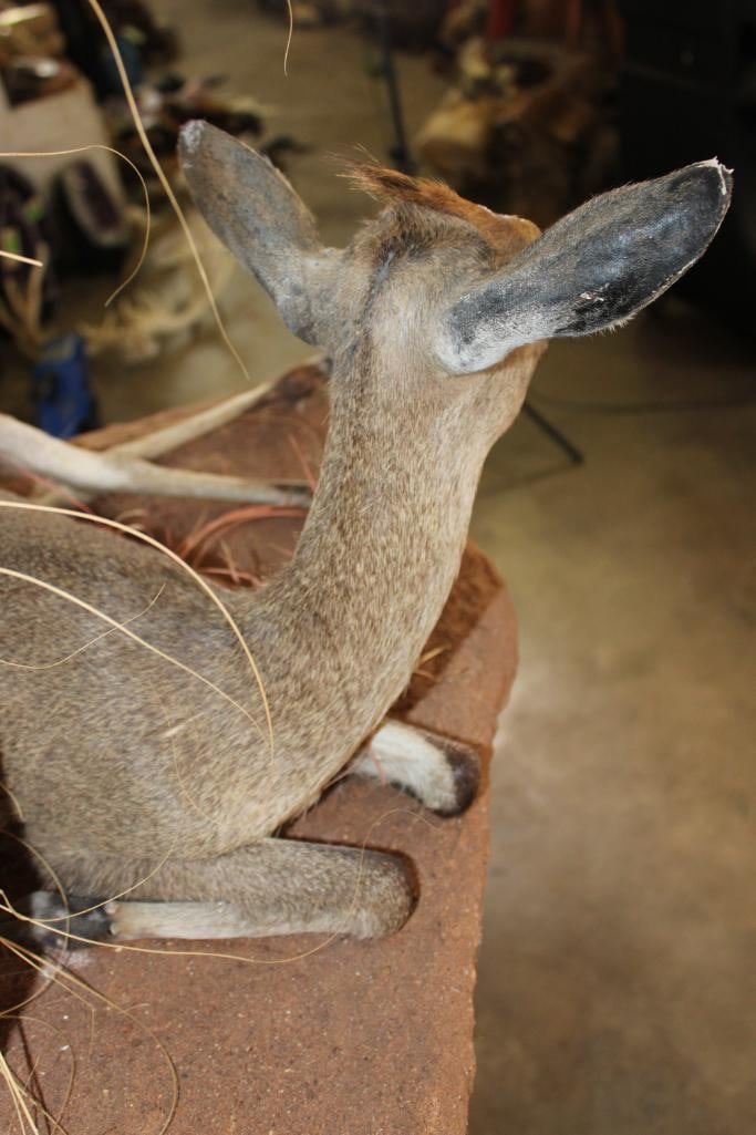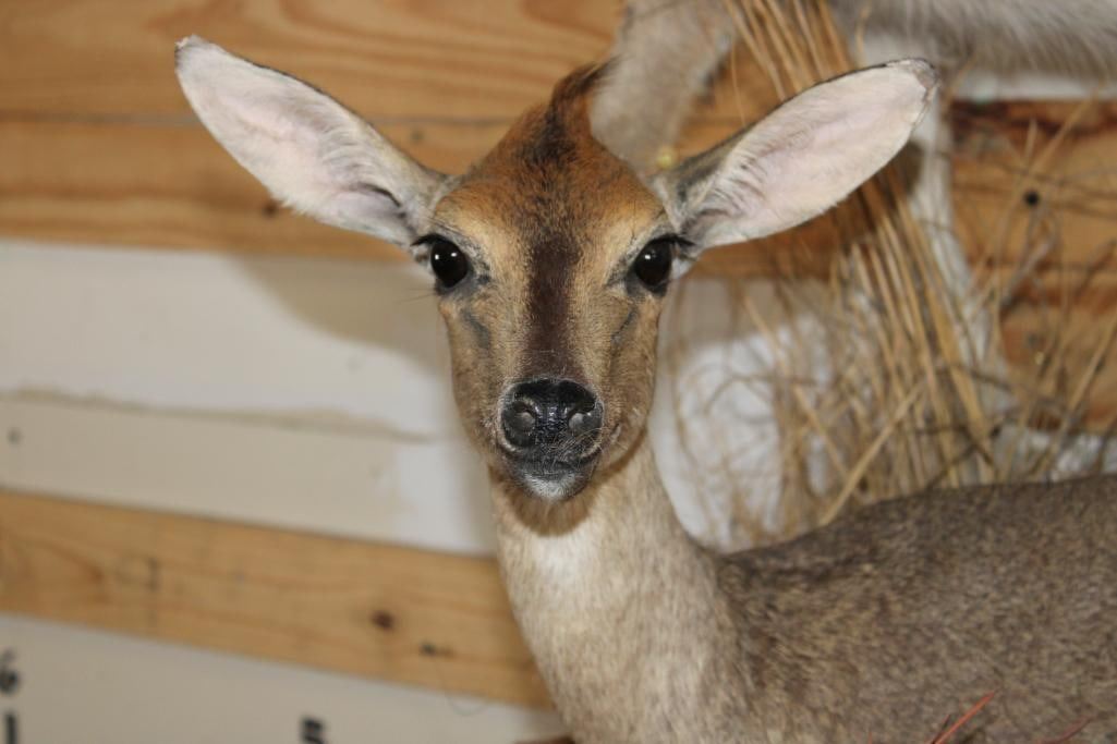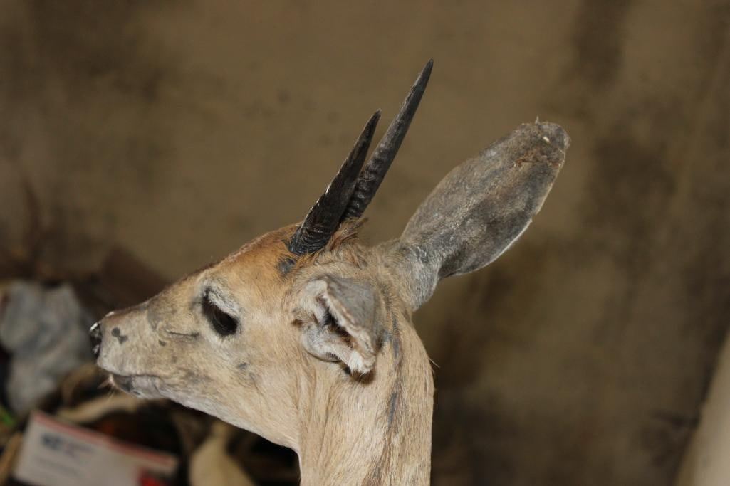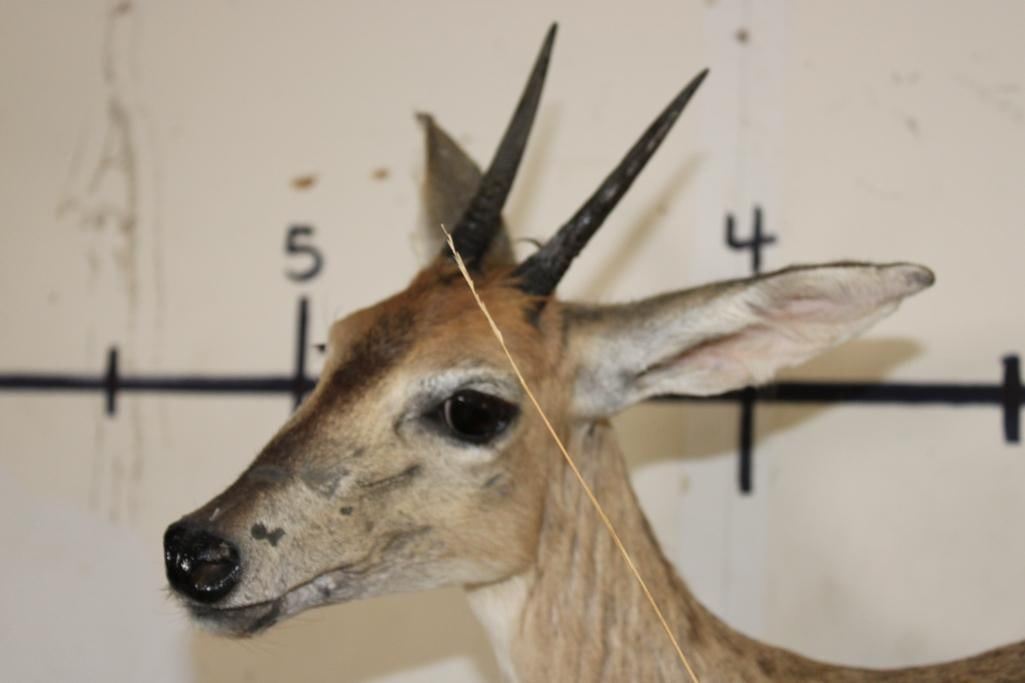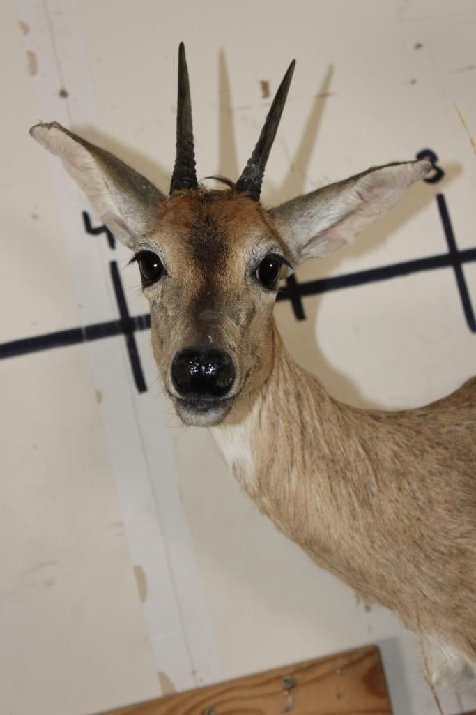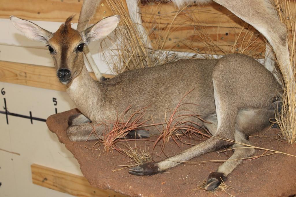2 Life-sized COMMON DUIKERS on a simulated Rock Wall Hanging Base. It measures 3' Long x 4' Tall x 2' Depth (from wall). It has minor hide rubs and minor ear damage but is otherwise a nice mount. TAXIDERMY