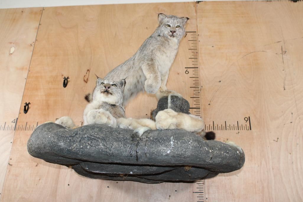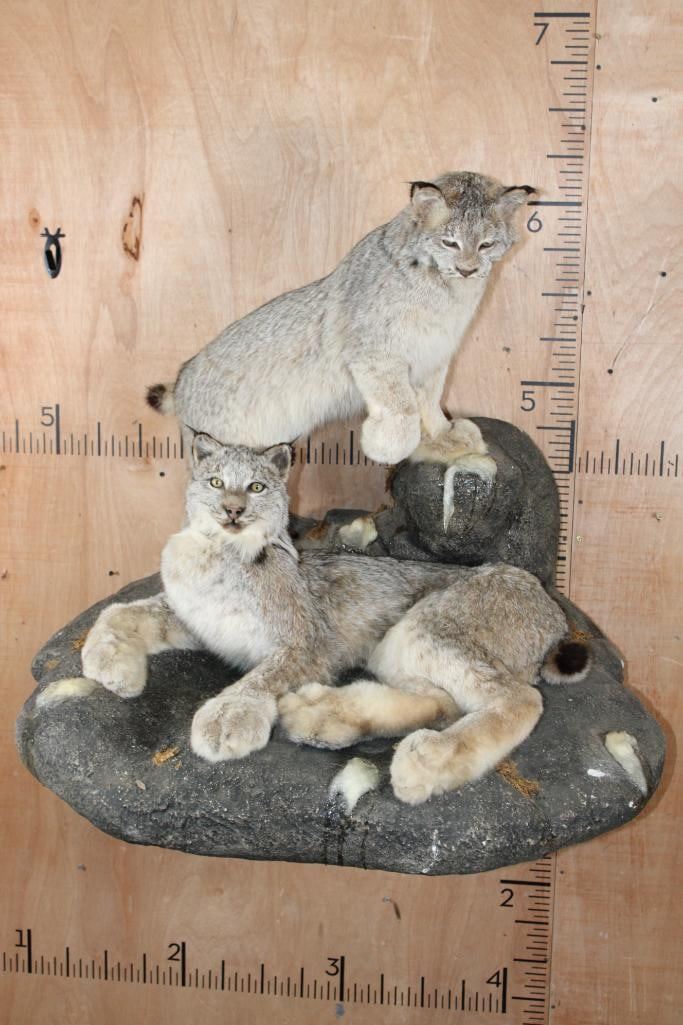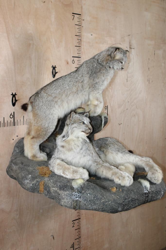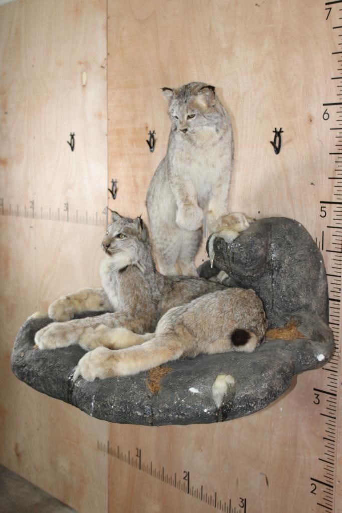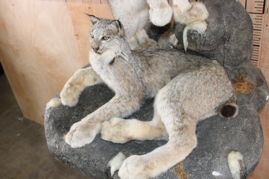 2 Very Nice and Clean Life-sized LYNX. They are mounted on a Rock Wall Hanging Base with icicles. The Total Mount measures 40" Long x 36" Tall x 33" Depth. This is High Quality taxidermy, both are in Very Good Condition. TAXIDERMY