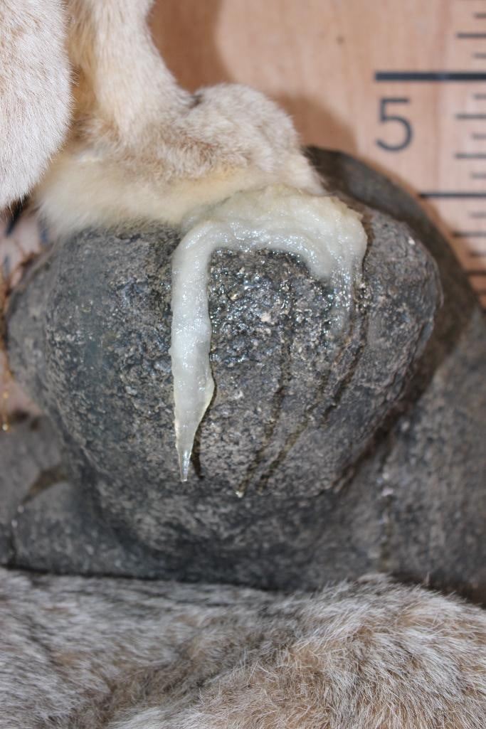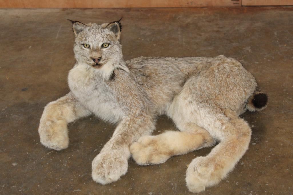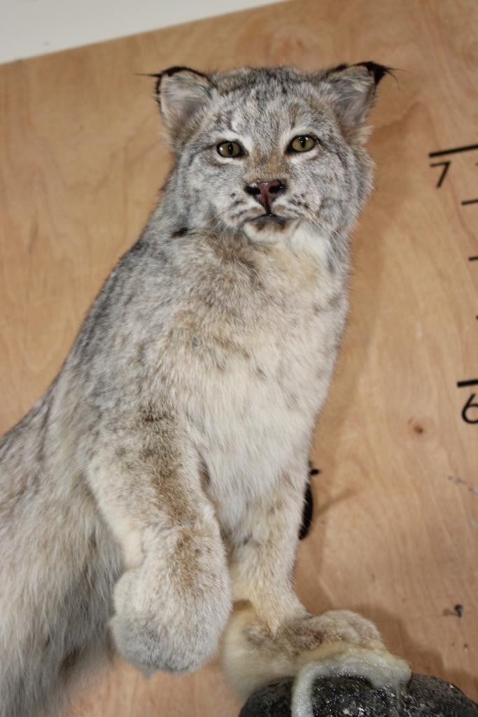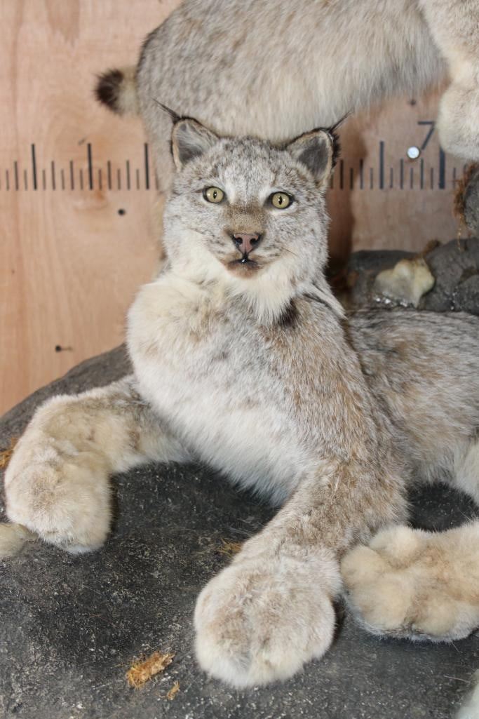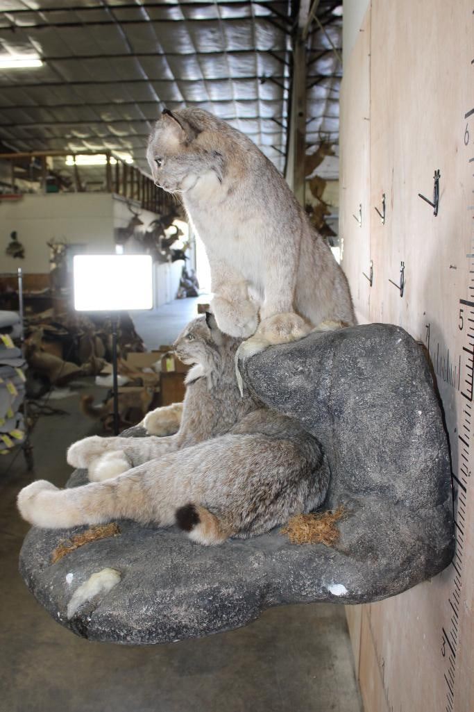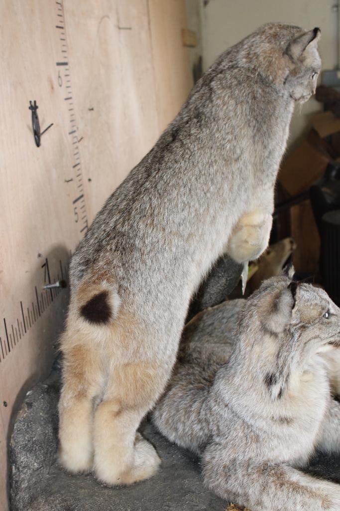 2 Very Nice and Clean Life-sized LYNX. They are mounted on a Rock Wall Hanging Base with icicles. The Total Mount measures 40" Long x 36" Tall x 33" Depth. This is High Quality taxidermy, both are in Very Good Condition. TAXIDERMY