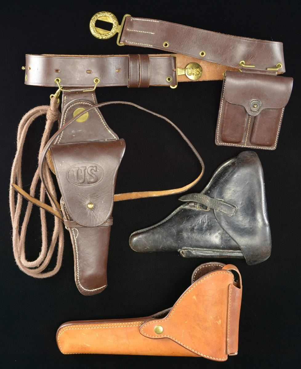 1) INTERARMS PARRABELLUM BROWN LEATHER HOLSTER. For 6" Barrel Luger pistol w/ mag. pouch on flap. CONDITION: good showing wear & light verdigris. 2) WWII GERMAN 1940 DATED LUGER HOLSTER. Back of holster has partially worn Berlin maker mark, German Party proof over "WaA286". CONDITION: holster in good intact condition w/ wear, marks, scratches & scuffs. Interior lift out strap has broken exterior tab. Holster exhibits mildew spots throughout. 3) US Cavalry style brown leather holster, belt, dbl. mag. pouch & lanyard cord. CONDITION: very good overall w/ light wear & verdigris. (02-19417/MD). $100-200.