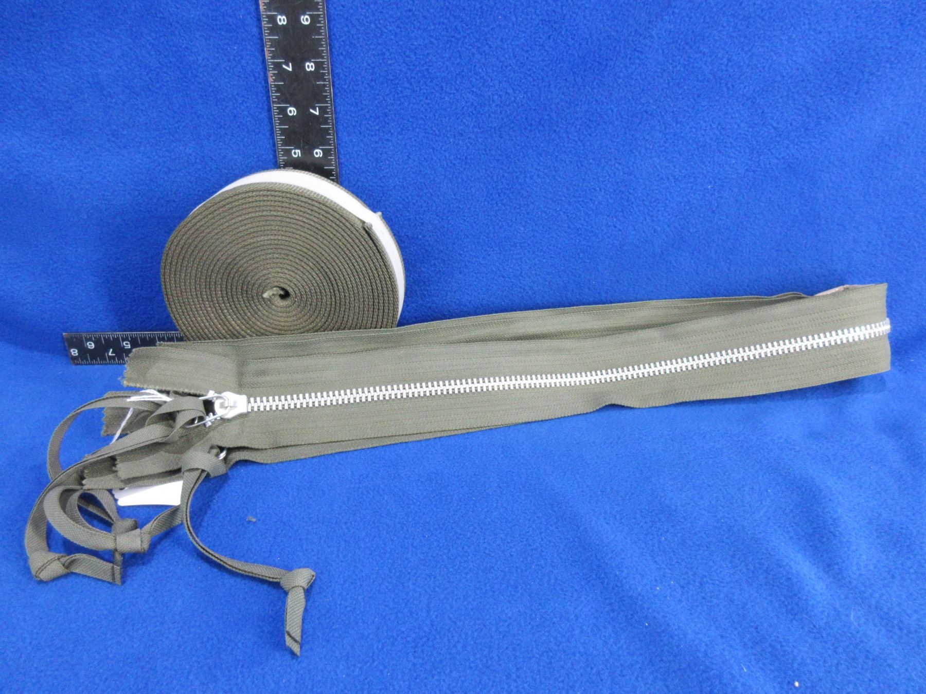 2 Military Zippers (36") & Roll of Army Green Nylon Webbing - Appears New