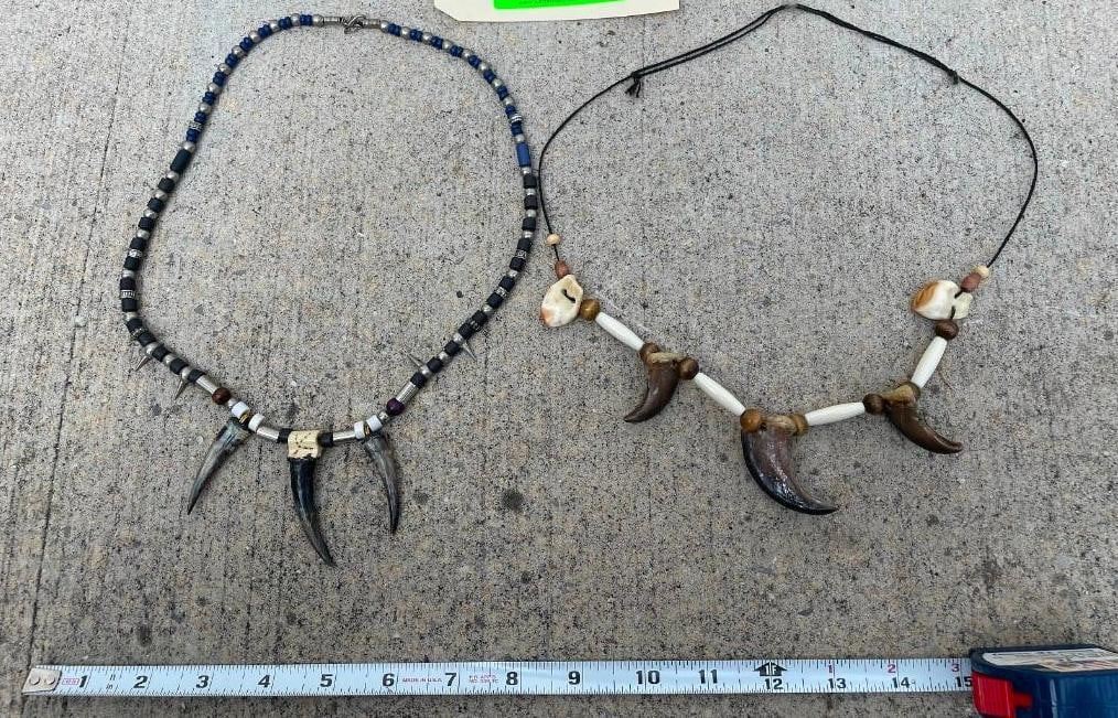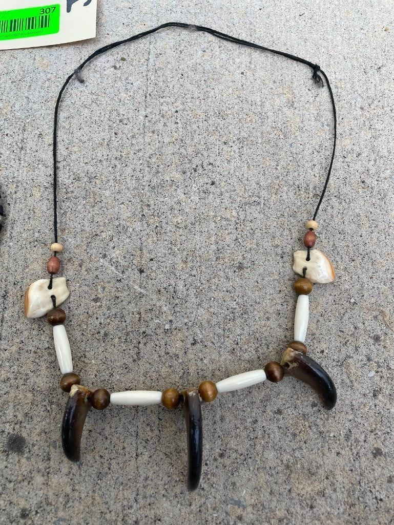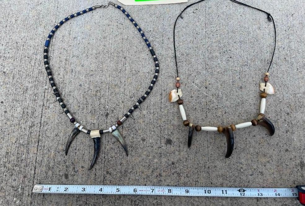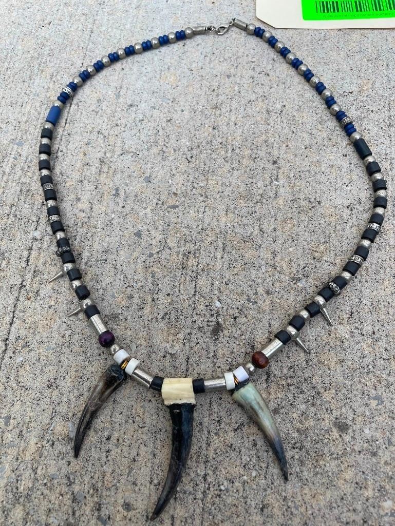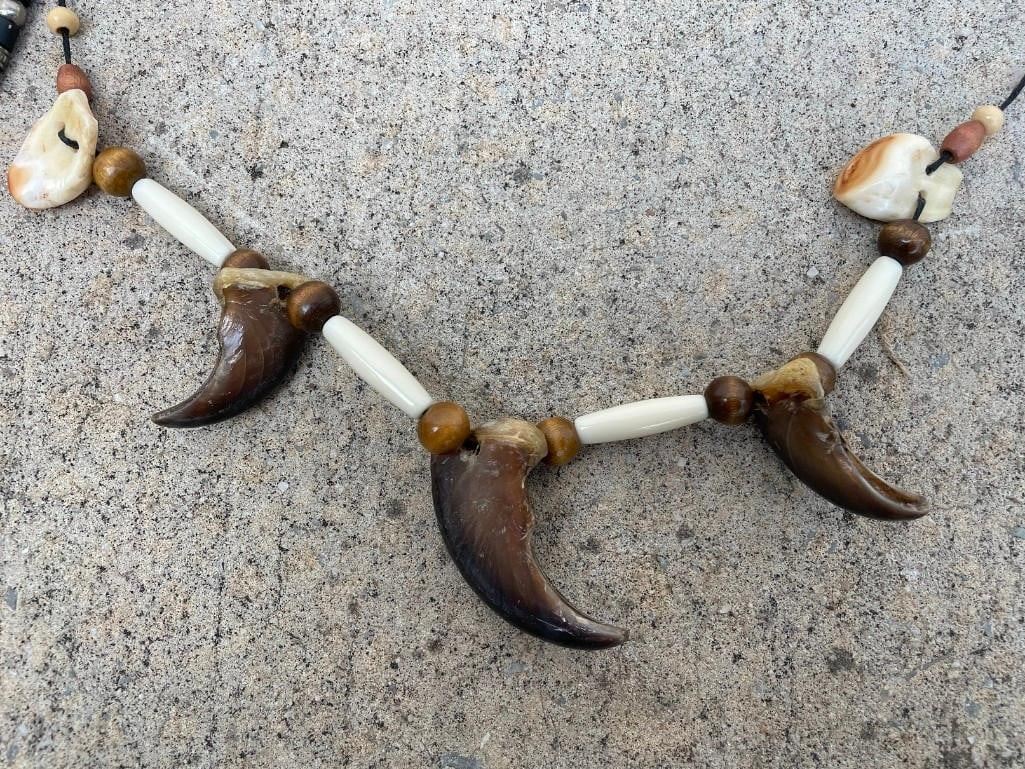 2 Native American style BEAR Claw Necklaces. One is adorned with ELK IVORIES and ELK Bone. The other has Spurs and metal spikes with bead-work. (ONE$) TAXIDERMY ACCESSORIES AND JEWELRY