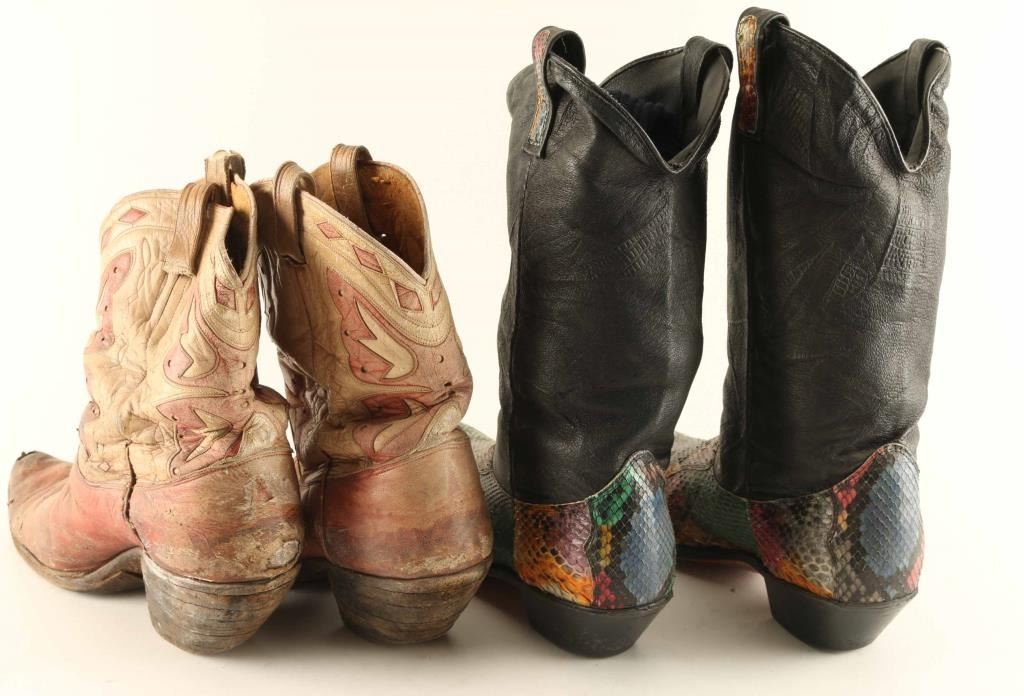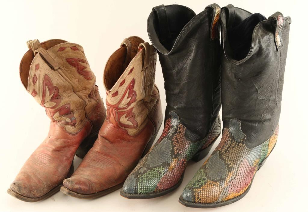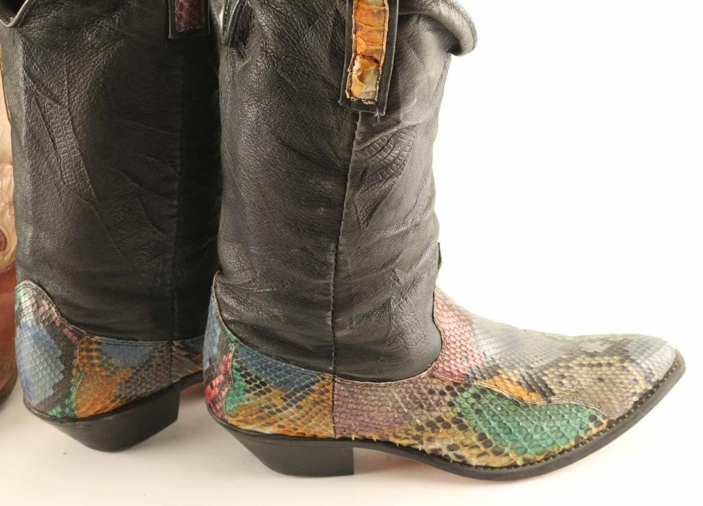 Includes (2) pairs of leather boots, (1) of which is red and white colored leather with a butterfly motif in okay condition, and (1) pair of rainbow colored snakeskin on black leather in very good condition.
