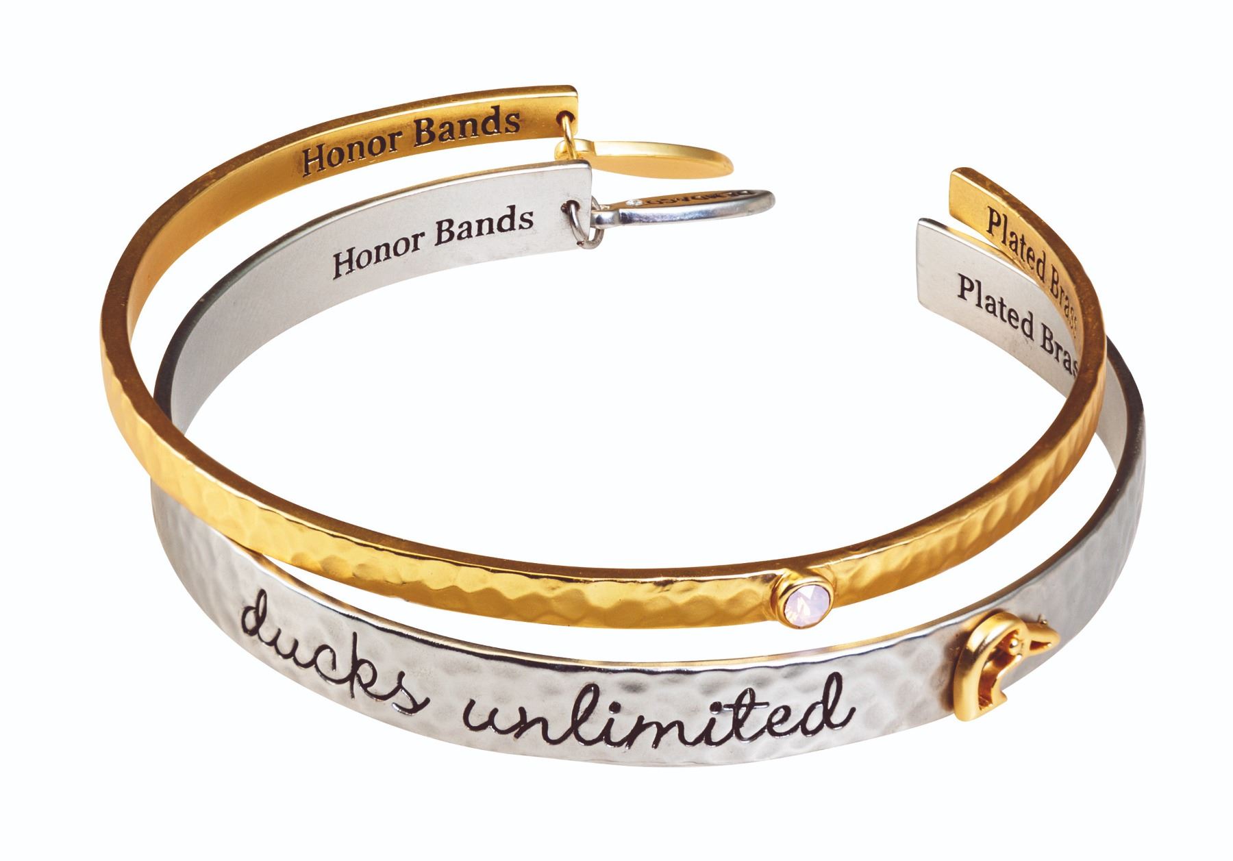 Adorn her wrist with two plated brass cuff bracelets with a hammered texture. The gold-tone bracelet has a crystal embellishment and 1/8” width. The silver-tone bracelet has a gold dimensional duck head and Ducks Unlimited script engraving. The adjustable bracelets come packaged in a display box with the Ducks Unlimited logo.