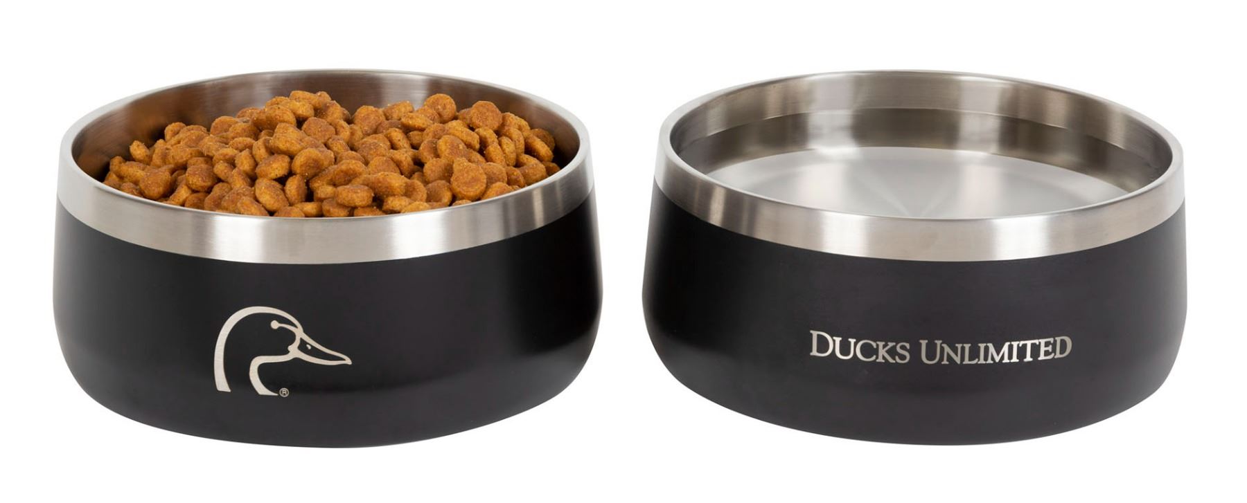 2-piece dog bowl set is ideal for any hunting companion. Each double walled bowl is made of stainless steel with a black powder coated matte finish. Features the DU logo on one bowl and “Ducks Unlimited” on the other. Includes a non-slip silicone ring on the bottom. Holds 7 cups