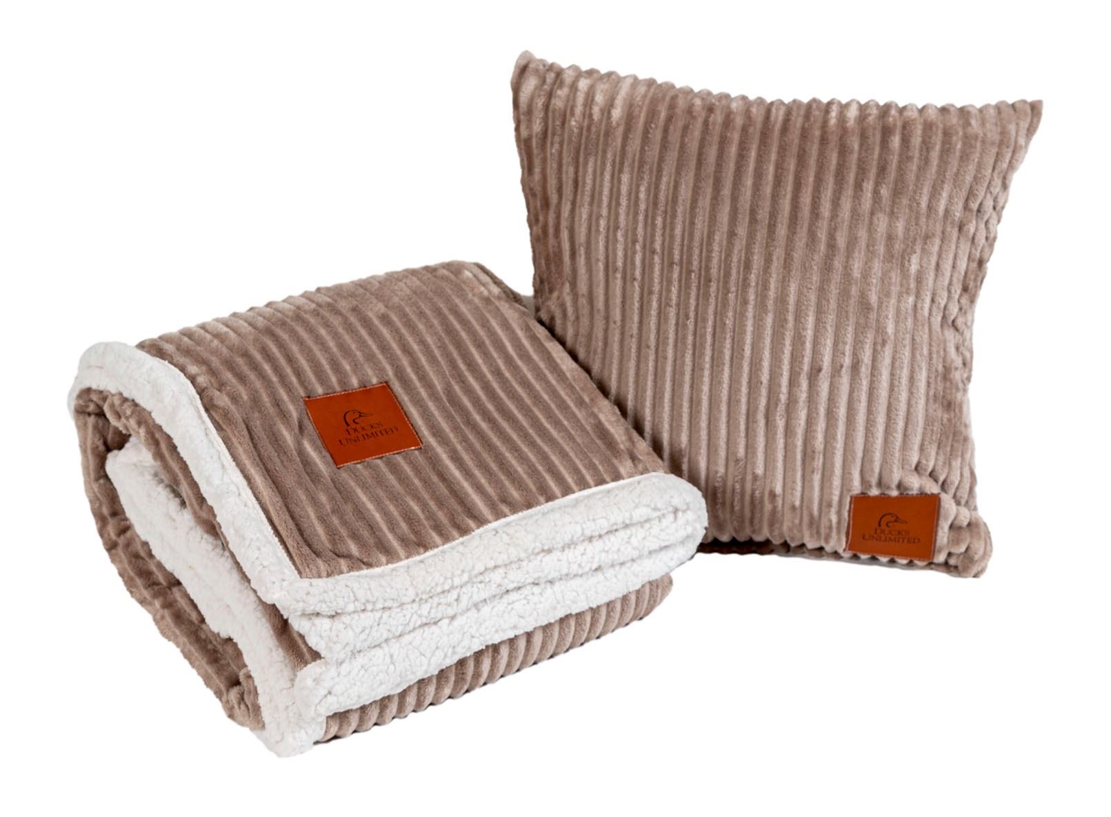 The perfect complement to any home, this tan corduroy throw and pillow set is sure to be a hit. The throw features faux Sherpa lining. Both throw and pillow have a faux leather Ducks Unlimited logo patch in the corner. Pillow 20” x 20” Throw 50” x 60”