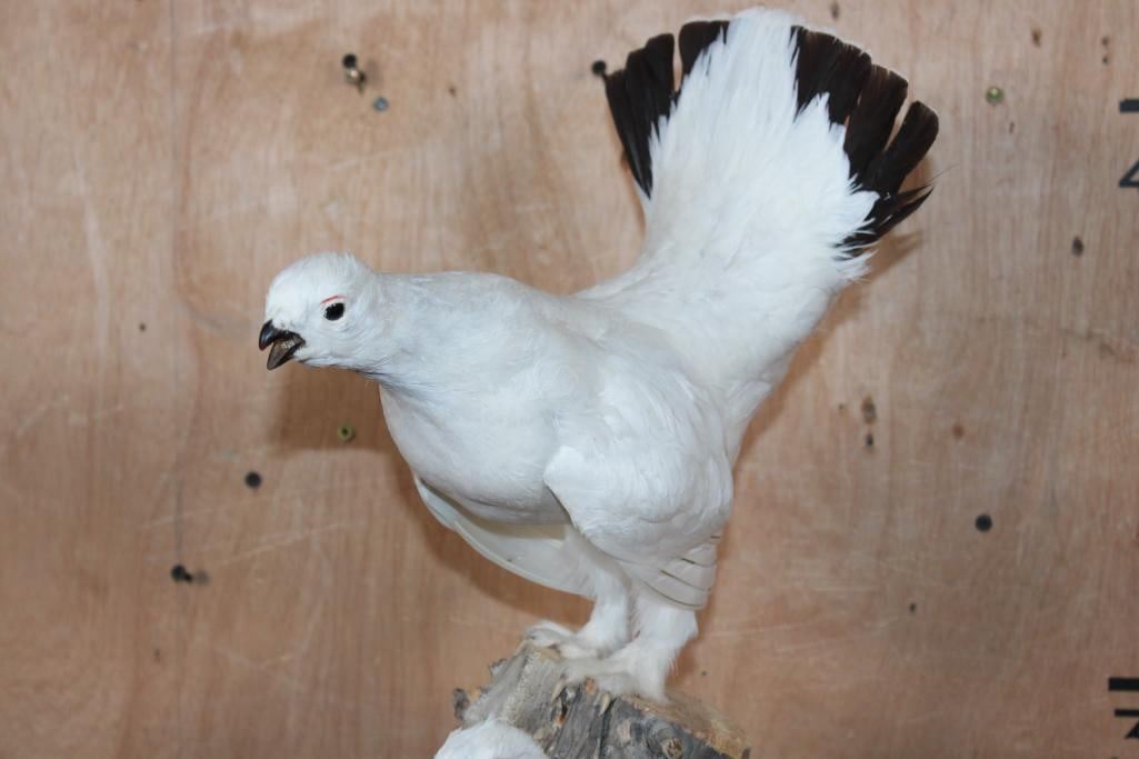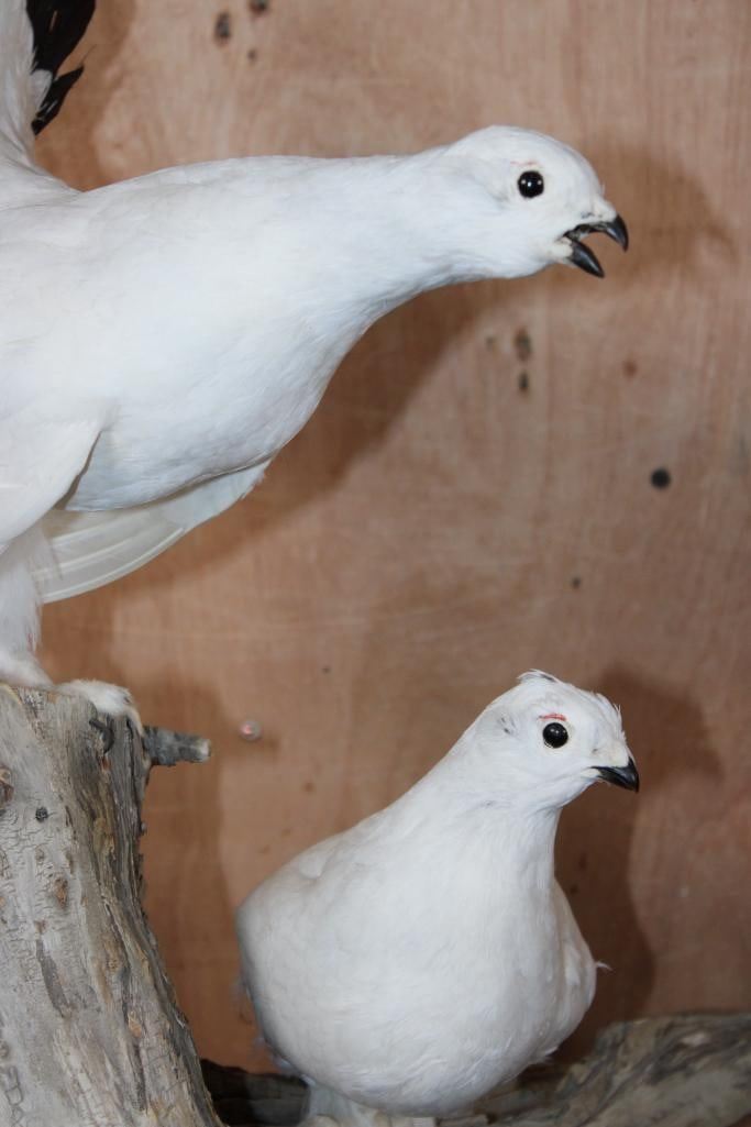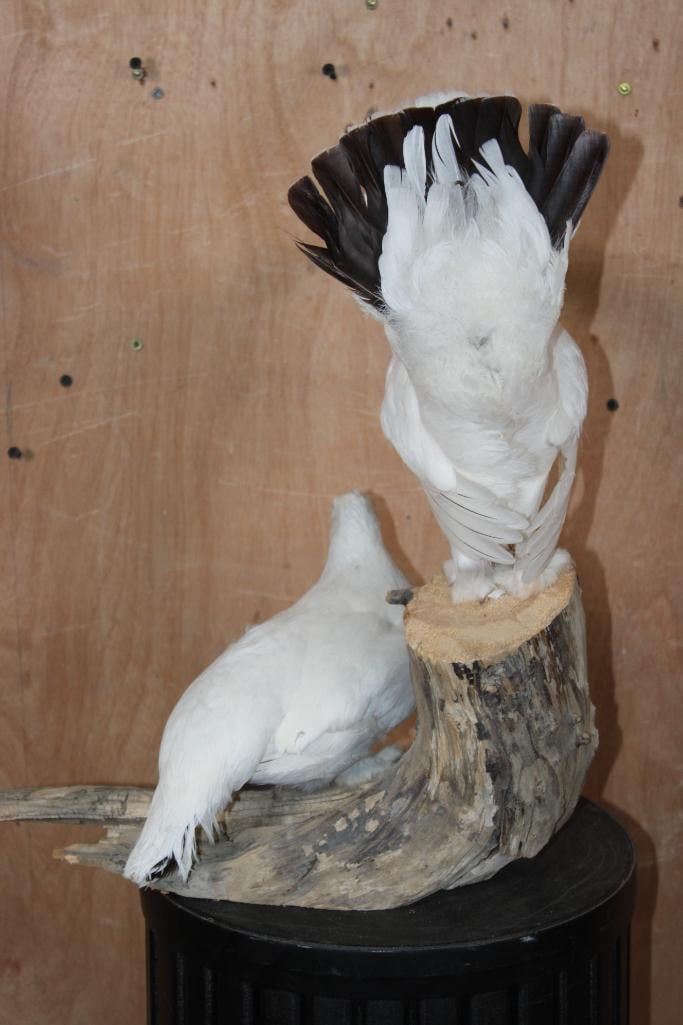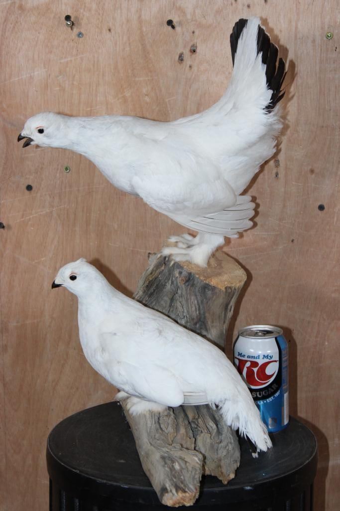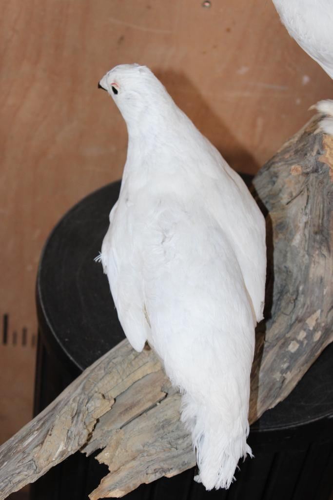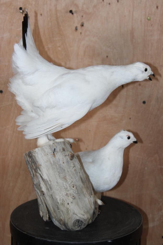 2 Very Nice and Clean ROCK PTARMIGAN Birds Displayed on a Wood Branch. The mount measures 19" Tall x 16" Long x 12" Depth and is in Very Good Condition. TAXIDERMY BIRDS