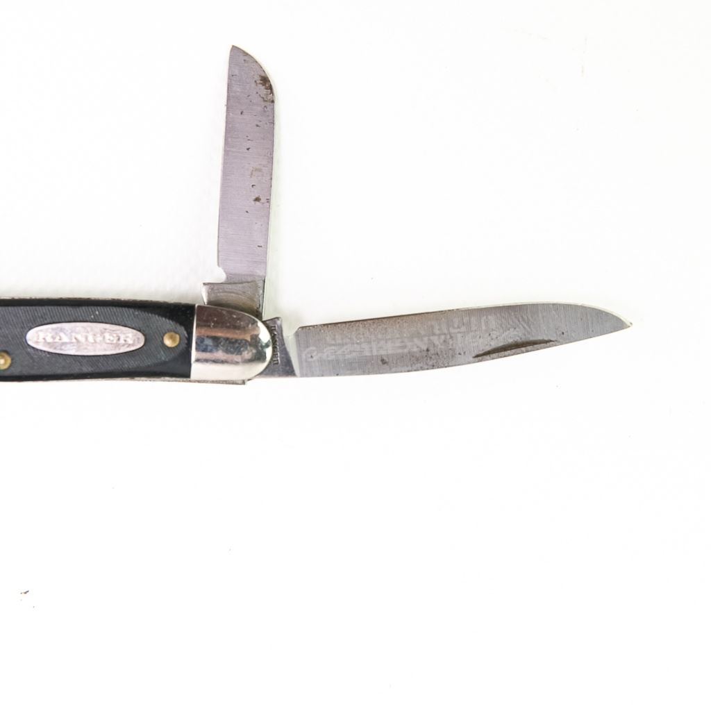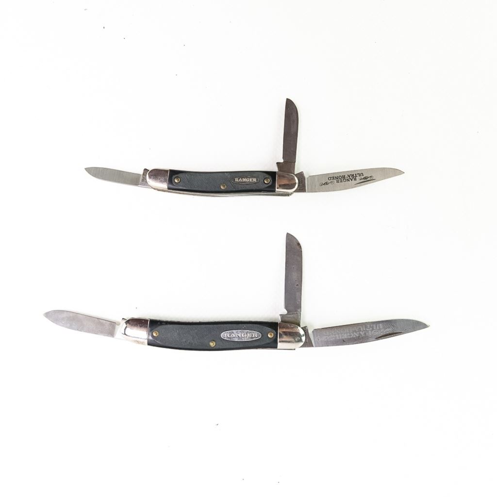 2 Ranger Cutlery USA made Ranger brand pocket knives. Both knives are based off of older Schrade designs but are more modern production with laser etched logos on blades. Both knives are in Excellent, used condition with factory edges on blades and only minor wear on bolsters. See photos.