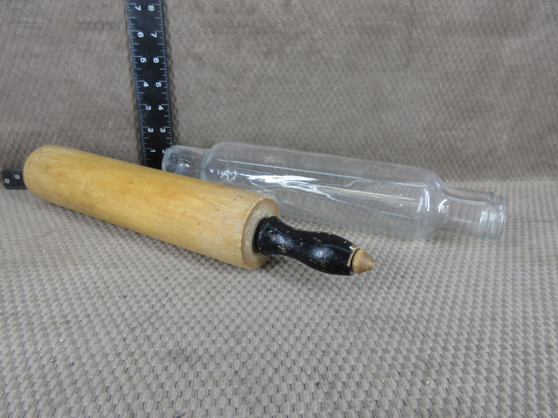 2 Rolling Pins - 1 Glass missing Lid, 1 Wood missing handle