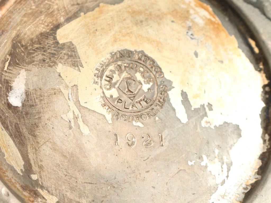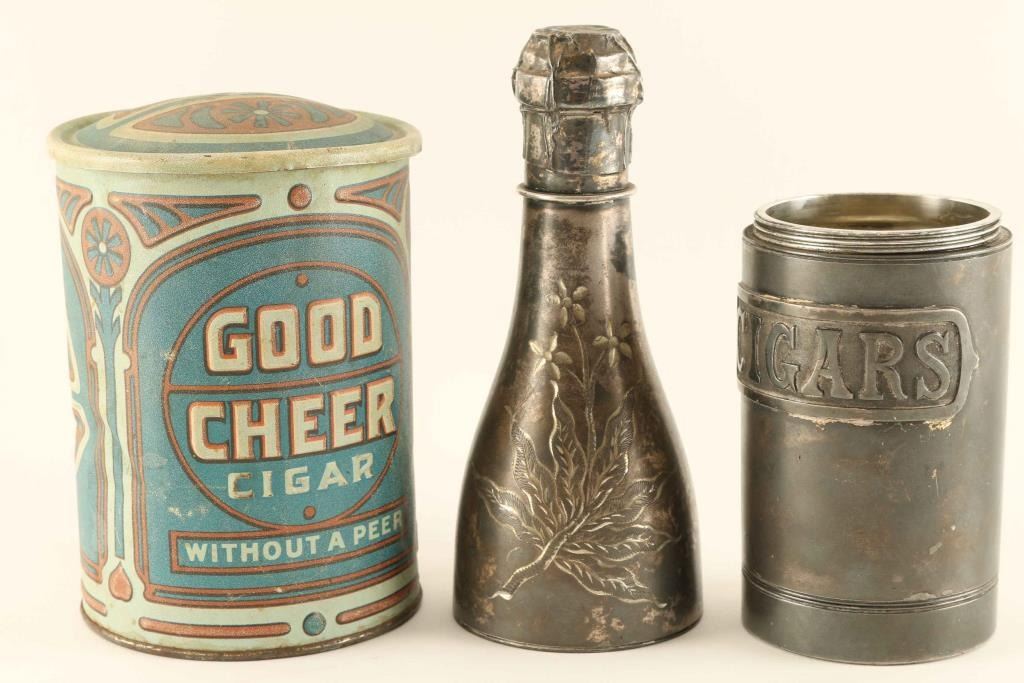 (1) Holder made by Pairpont MFG Co New Bedford Mass marked Cigar holder in form of a champagne bottle, unscrews to hold cigars, quadruple silver plated. (1)Cigar Tin in the form of a stein advertises "Good Cheer" Cigars and used as container for in store sales.