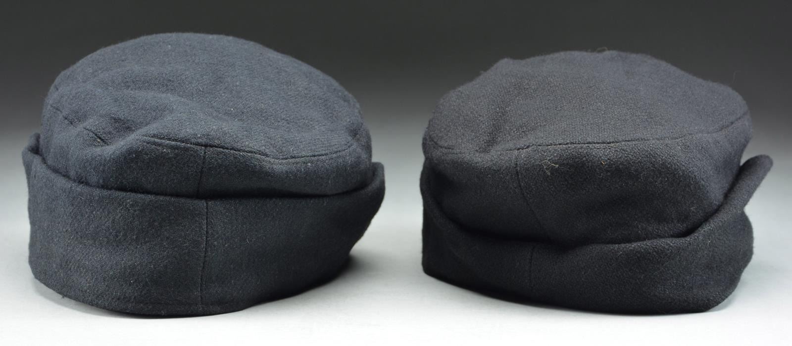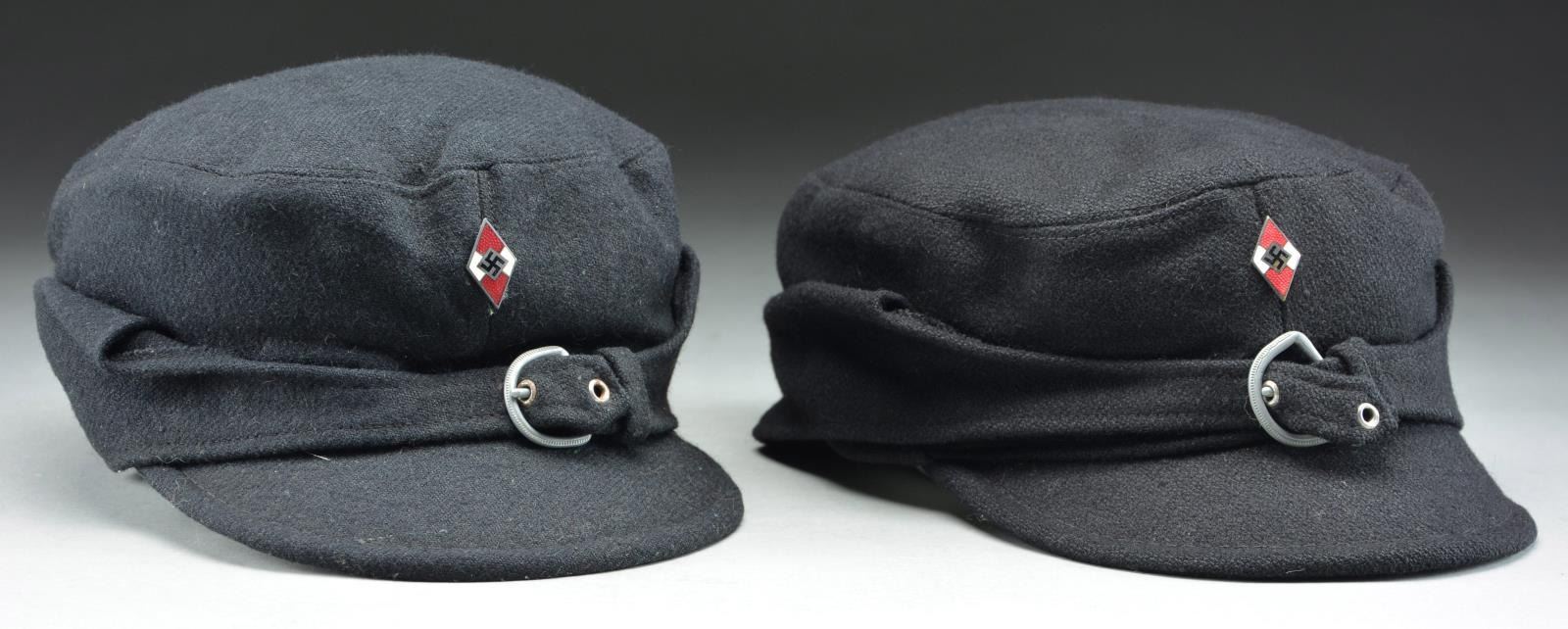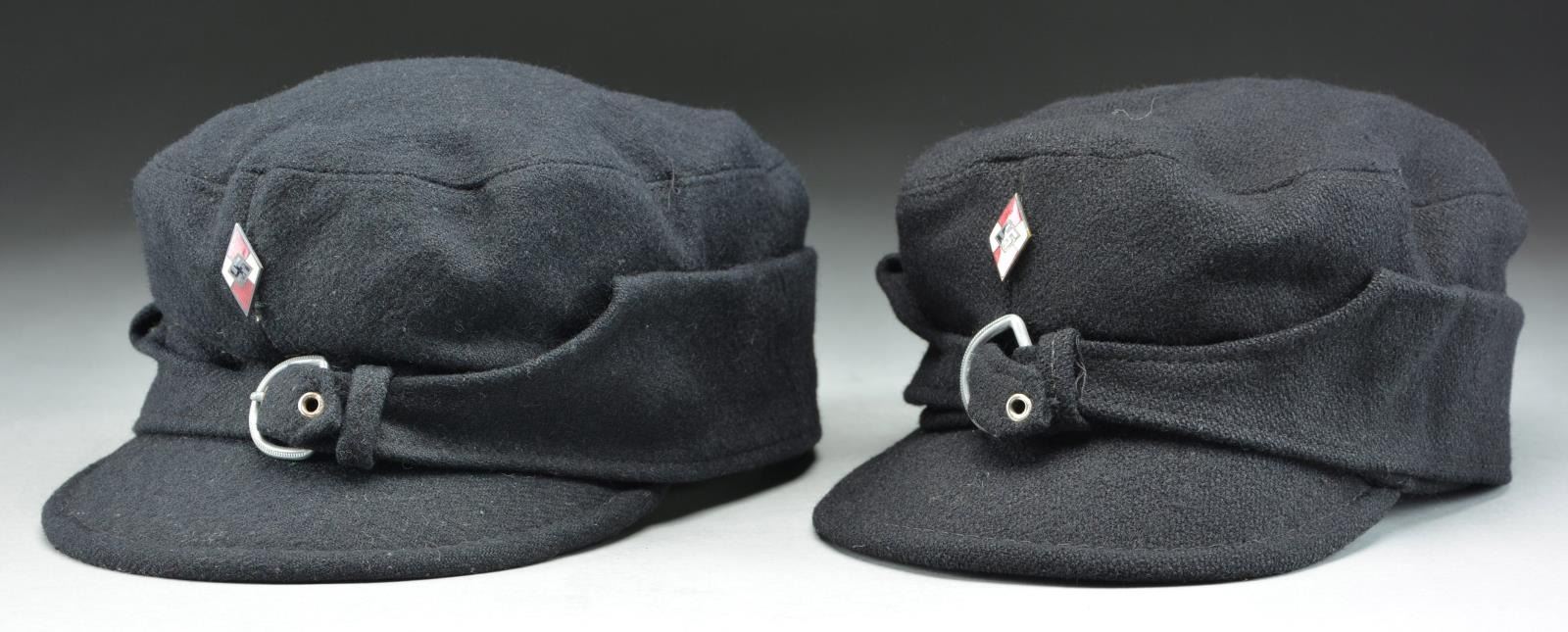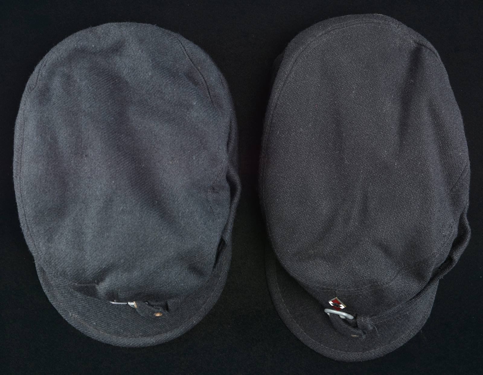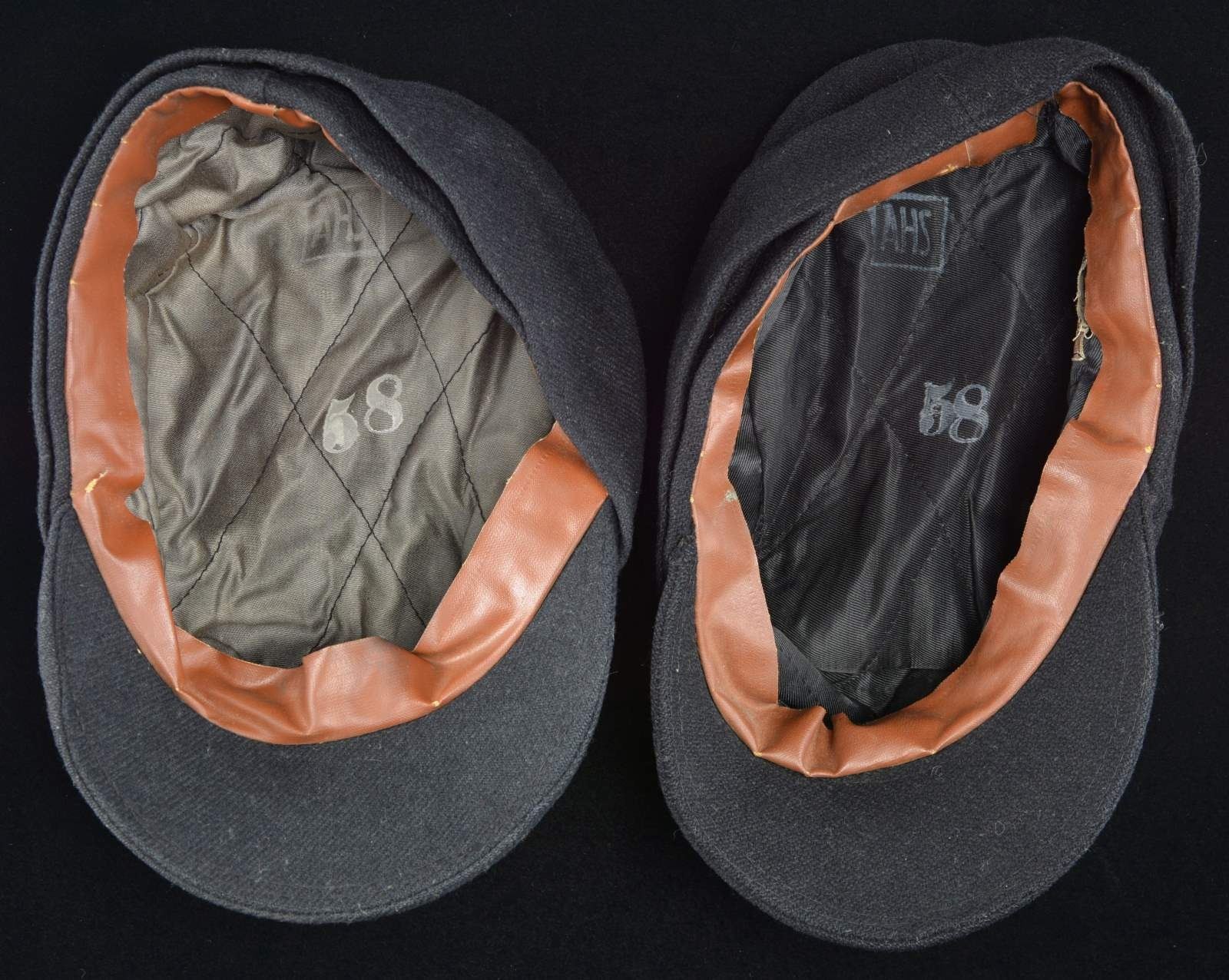 1) This cap is made of heavy black wool with ear flaps that buckle in the front. There is a red, white & black enamel HJ diamond on the front. The interior has a brown faux leather sweatband & a black rayon lining. The lining is stamped in white “AHS” in a rectangle and size “58”. There is also a brown RZM tag that is titled “Mutze fur HJ-DJ”. CONDITION: hat shows light overall wear. Sweatband is a bit dry. 2) This cap is made of heavy black wool with ear flaps that buckle in the front. There is a red, white & black enamel HJ diamond on the front. The interior has a brown faux leather sweatband & a gray quilted rayon lining. The lining is stamped in white “AHS” in a rectangle and size “58”. There is also a brown RZM tag that is titled “Mutze fur HJ-DJ”. CONDITION: hat shows light overall wear. Sweatband is a bit dry. (02-19773/BF). $400-600.