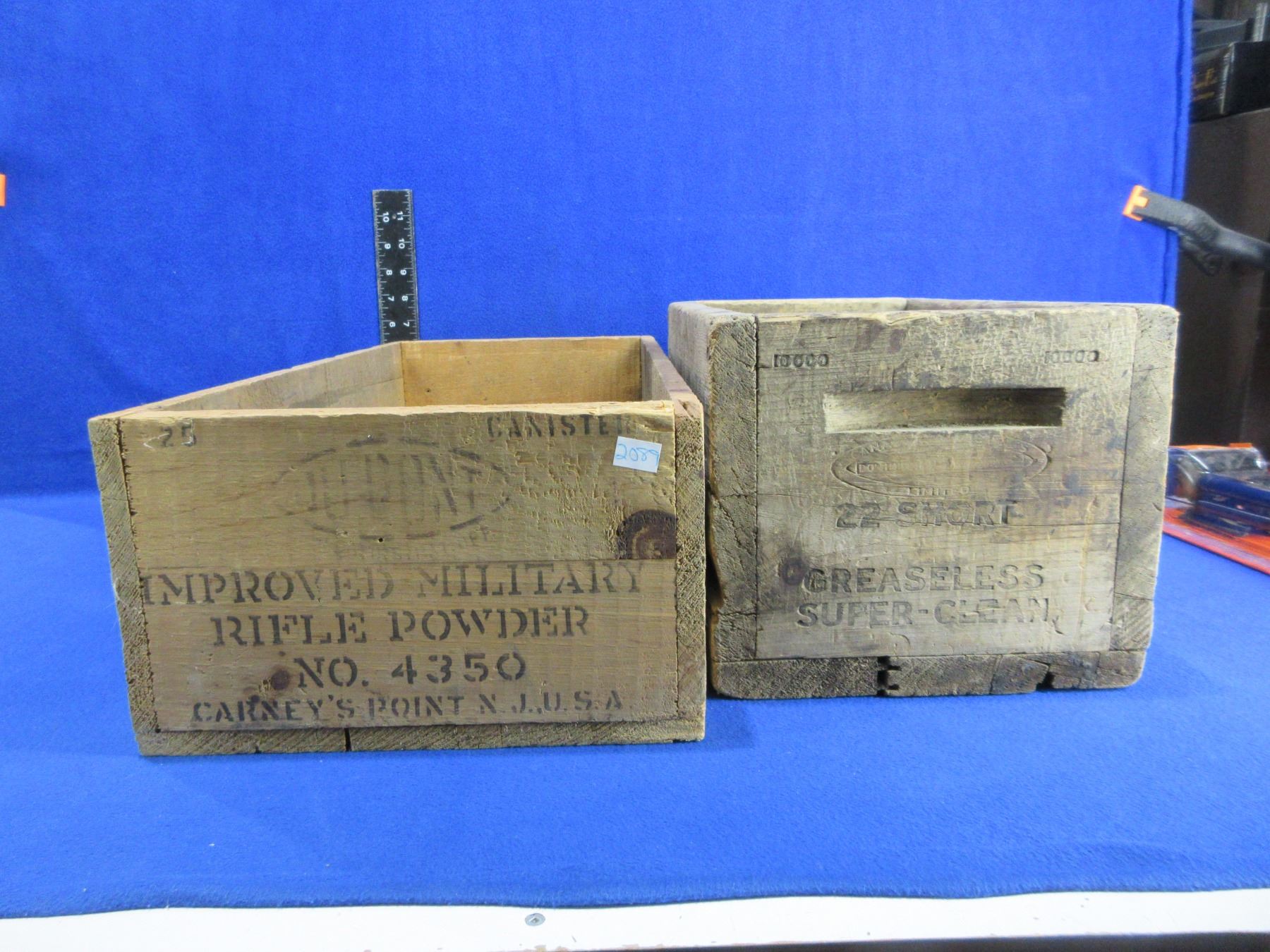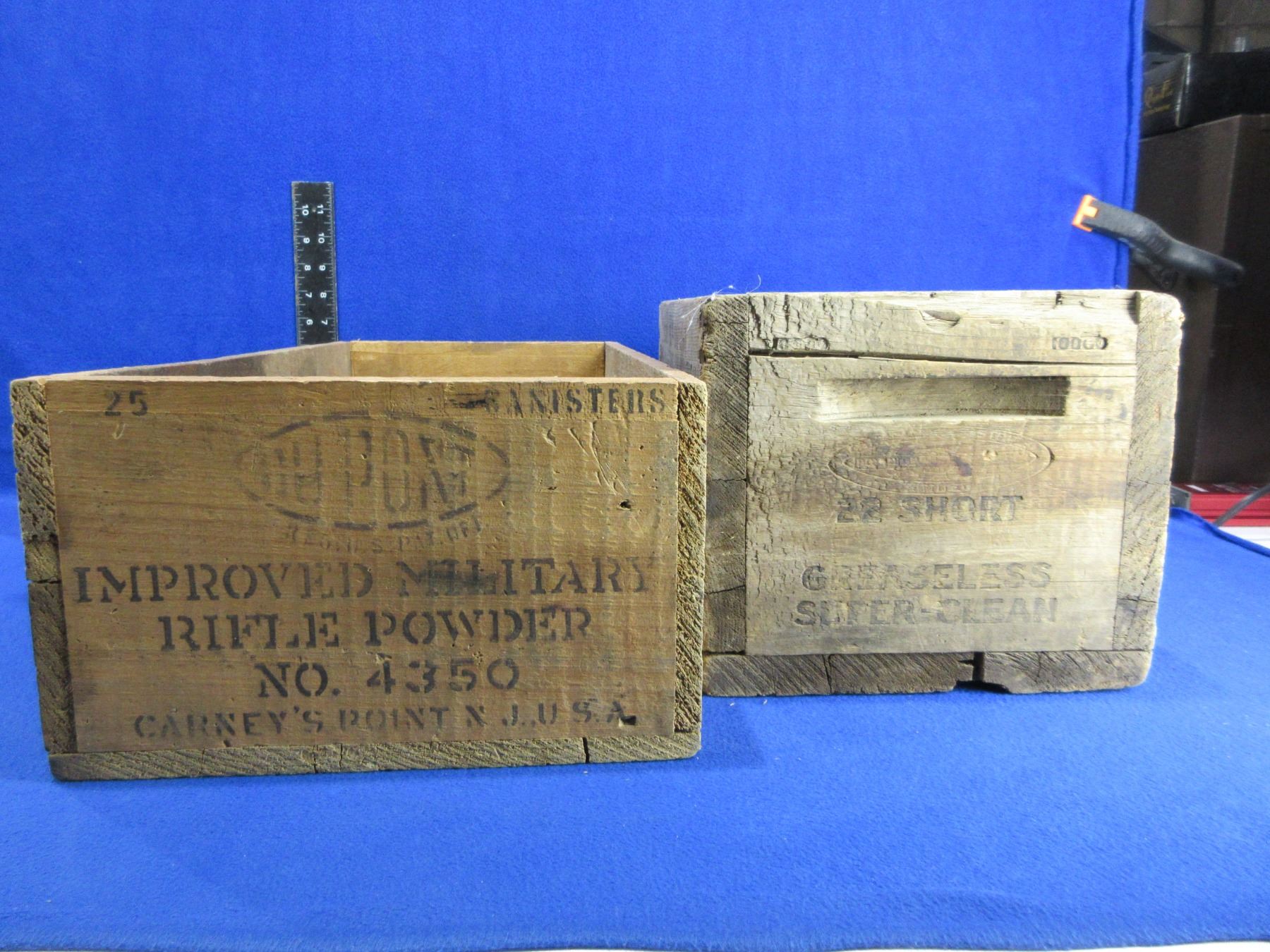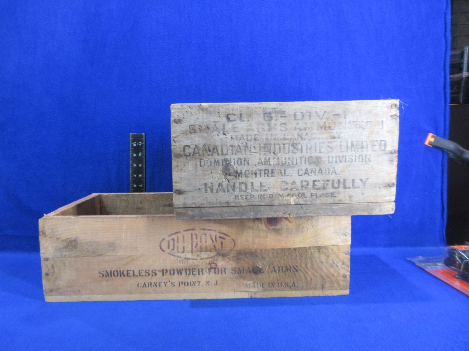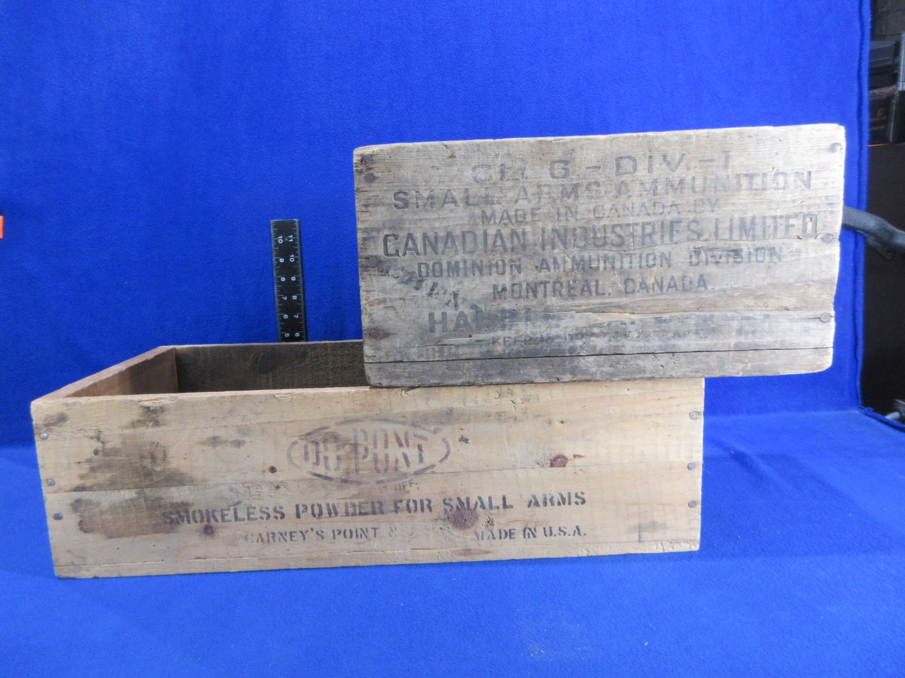 2 Wood Ammo Boxes - DuPont (21 3/4" x 10 1/4" x 6" High) and CIL Dominion (14 3/4" x 8 1/2" x 7 1/2" High)