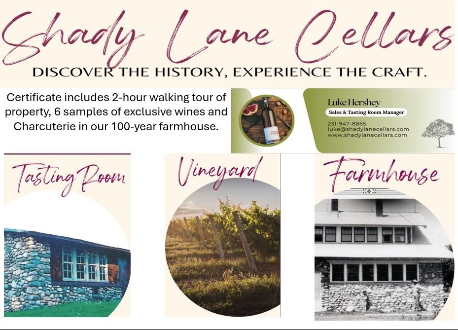 Certificate includes 2-hour walking tour of property, 6 samples of exclusive wines and Charcuterie in our 100-year farmhouse.Donated by Shady Lane Cellars