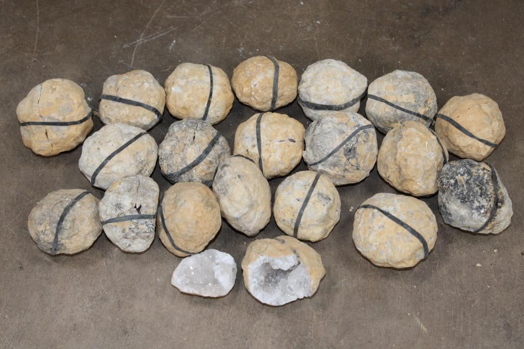 20 CLEAR QUARTZ Crystal Geodes. Some have been broken in 2 pieces and some are broken into 3 pieces. The Total Weight is 5 lbs 7 oz. (ONE$) ROCKS FOSSILS MINERALS CRYSTALS