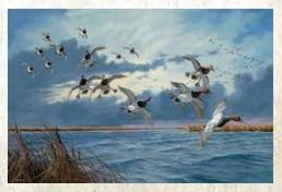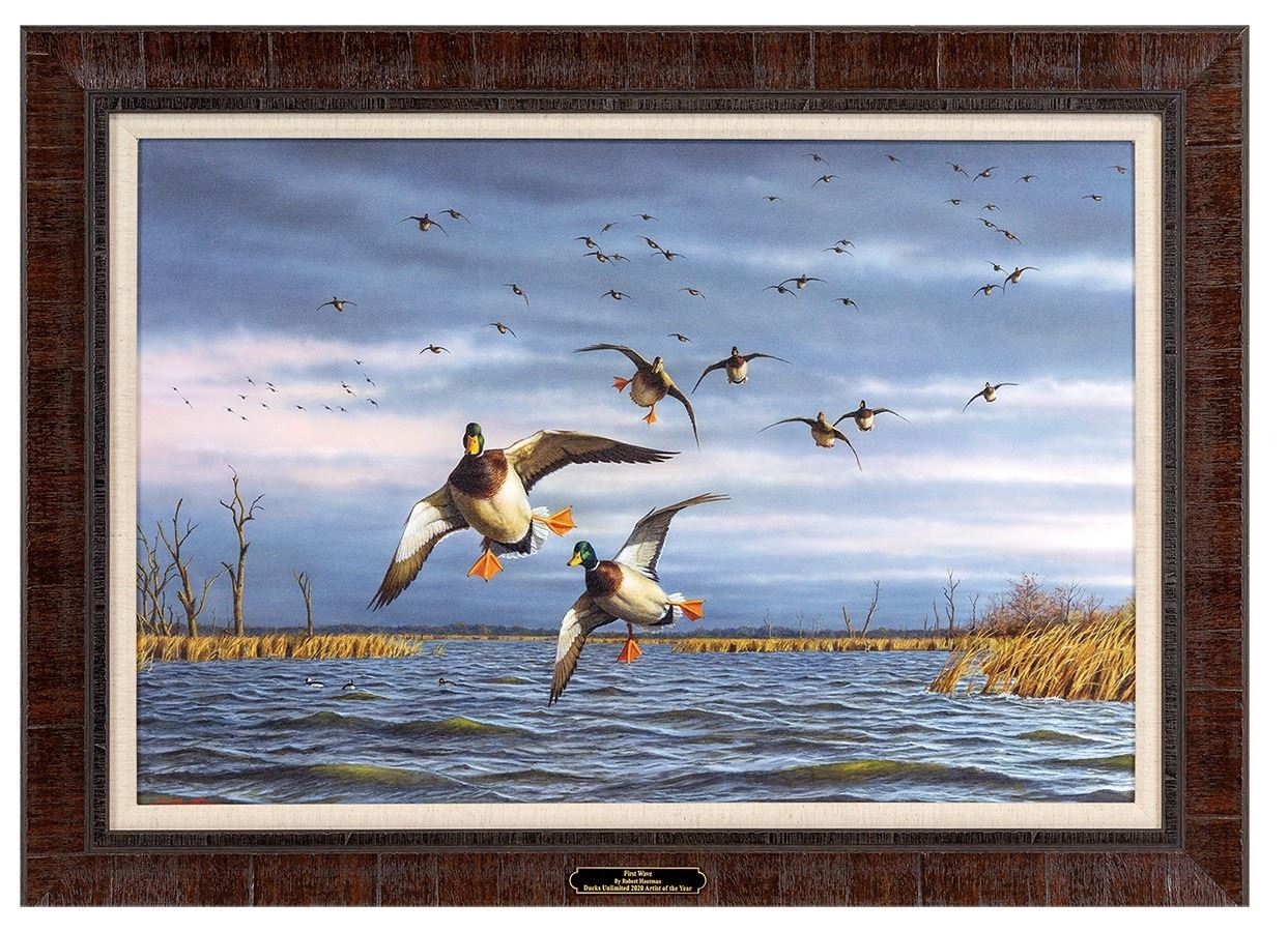 This is a collection of all 5 of the DU 2020 National Prints. All prints are framed, matted with glass. 1. First Wave Artist of the Year Canvas by Bob Hautman: Image Size: 20”x30”. Bob Hautman lives and works on a farm in western Minnesota with his studio overlooking wetlands that he has restored for more than two decades. This is the first DU Artist of the Year title awarded to Hautman. First Wave depicts mallards coming straight in wave after wave as a storm approaches. The canvas features a 2020 Artist of the Year title plate affixed to the frame. 2. A Good Day by Bob Hautman: Image Size: 18”x24¼”. Bob Hautman credits his artistic success to his father who bestowed to him a love for the outdoors and a commitment to conservation and his mother, an accomplished painter. In A Good Day, Hautman beautifully captures a proud yellow lab after a perfect day of hunting. The cork decoys featured in the image were carved in the 1940s by the artist’s father. 3. Perched by Jared DuCote: Image Size: 15½”x23½”. Texas painter Jared DuCote highlights the natural beauty of a wood duck Perched on a limb. This is the artist’s first appearance in the DU National Art Package. DuCote and his father share a love for art, which led them to paint custom fishing lures together. 4. Windswept Bay by David Maass: Image Size: 16¾”x25¼”. David Maass has received the Ducks Unlimited Artist of the Year title more times than any other artist. Windswept Bay showcases canvasbacks and bluebills making their descent with gray clouds approaching. Maass is a self-taught wildlife illustrator who was raised in a family with a long-standing hunting tradition. 5. Big Ten by Bruce Miller: Image Size: 24”x18¾”. This is Bruce Miller’s 10th image in the Ducks Unlimited National Art Package. Big Ten captures the majesty of a whitetail buck in its natural surroundings. As a native Minnesotan, Miller chose the title Big Ten because of the buck’s trophy rack and in reference to the conference.