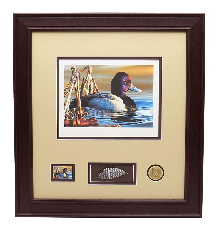 The 2021/2022 Federal Duck Stamp created by artist Richard Clifton. This is Clifton’s second Federal Duck Stamp win. The print and stamp image features a single lesser scaup drake. It is framed, double matted, and inlaid with a DU crest medallion and carved feather exclusive to DU events. It measures 21”x 19 ½”.