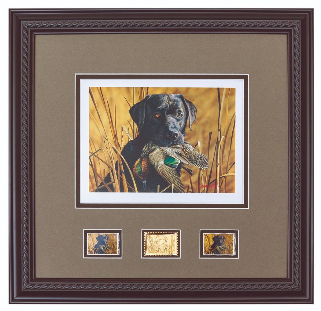An image of a black lab with retrieved green-winged teal is the 38th design in the DU Stamp Print series. It was created by artist Bob Hautman who was inspired by the iconic “King Buck” Federal Duck Stamp image. The piece is framed and double matted and includes the matched DU stamp print, stamp medallion, mint stamp, and artist signed stamp.